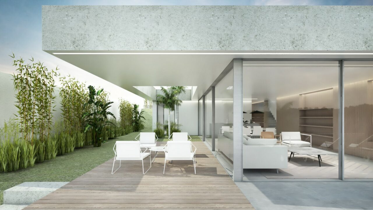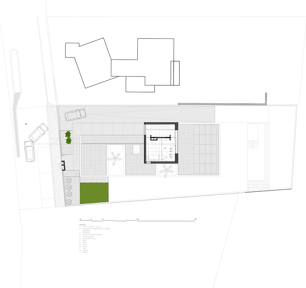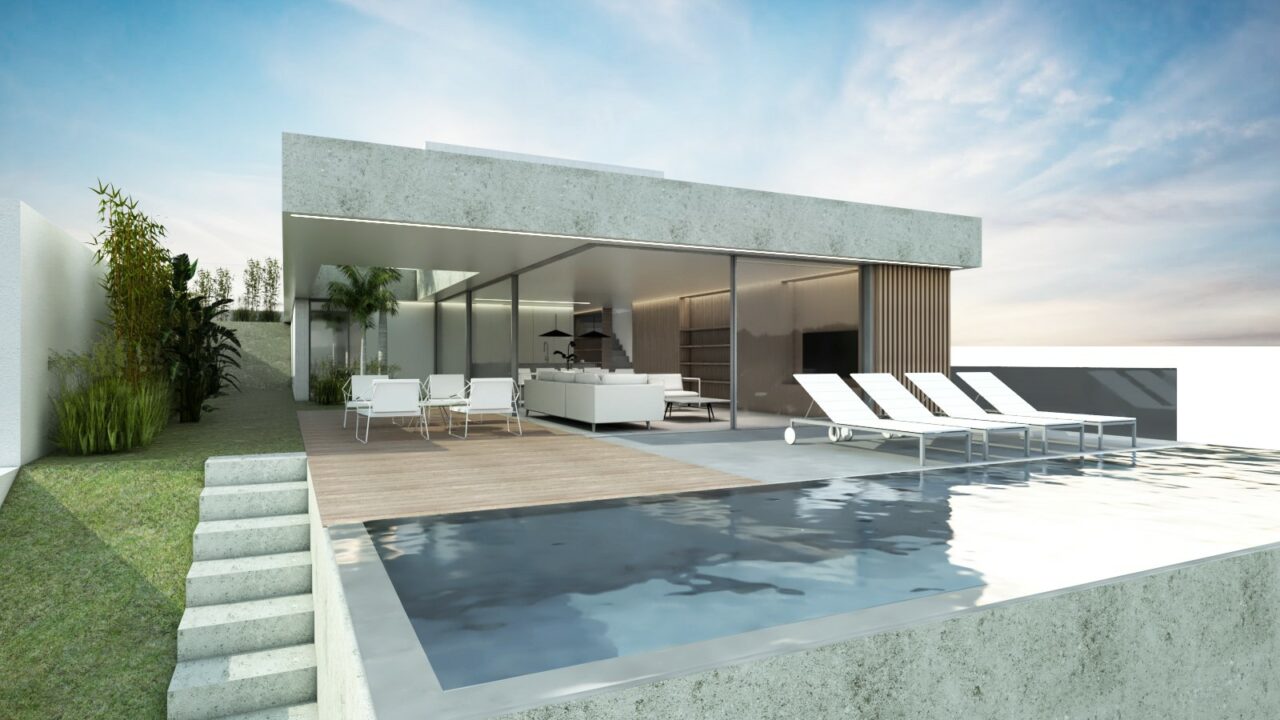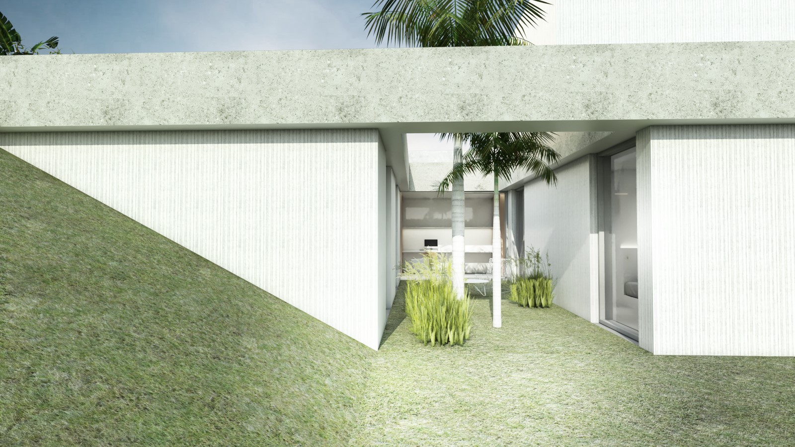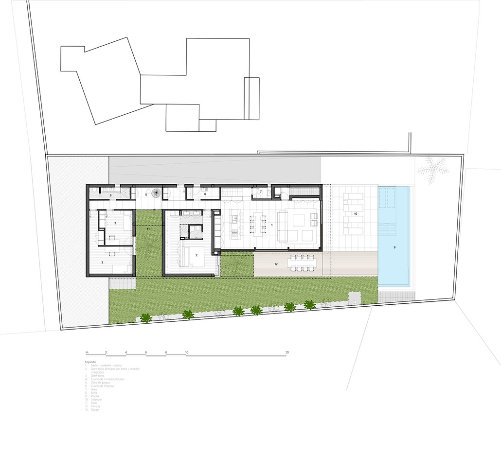 Casa Gipa is located on an elongated plot with a steep slope. The housing program is mostly developed on one floor, leaving only a study on the upper floor. The volume develops linearly, where the bedroom stays open through a garden patio and the living room and kitchen open onto a platform where a large swimming pool develops across its entire front.