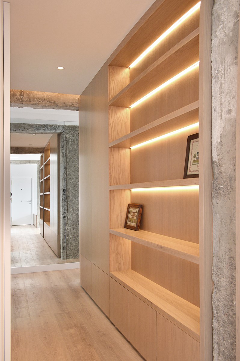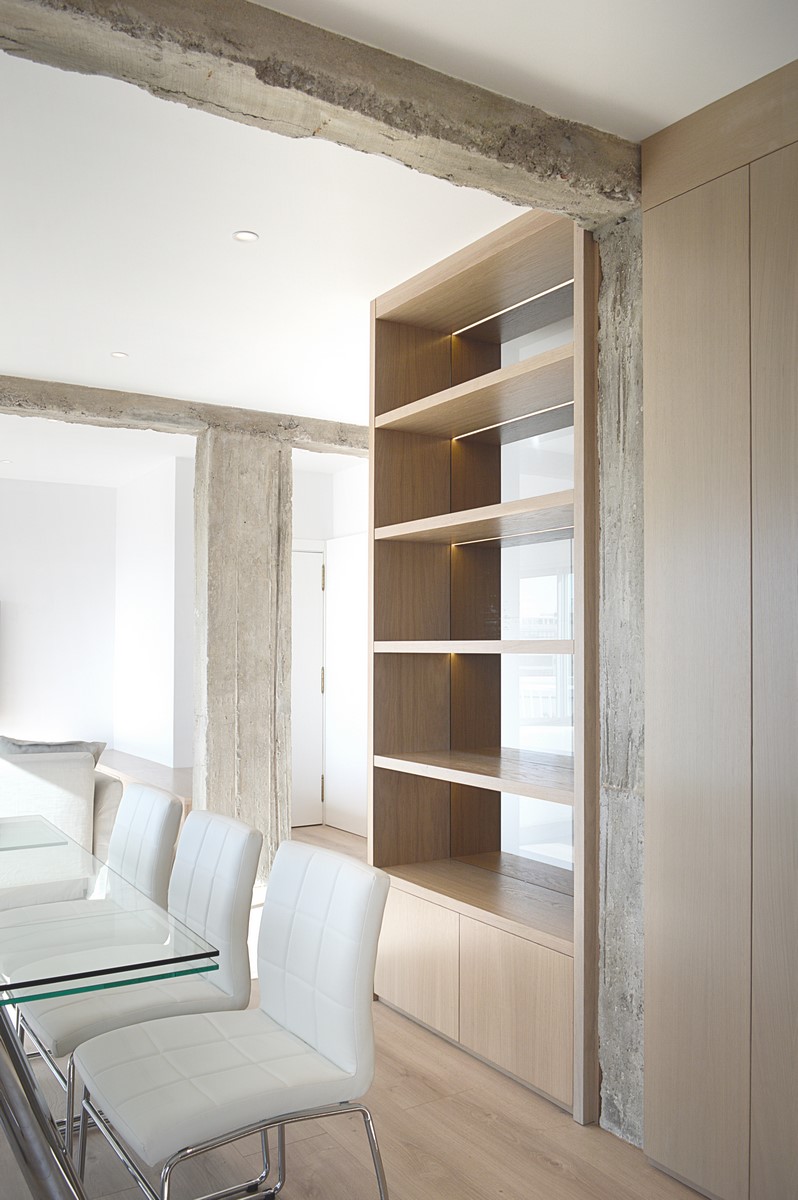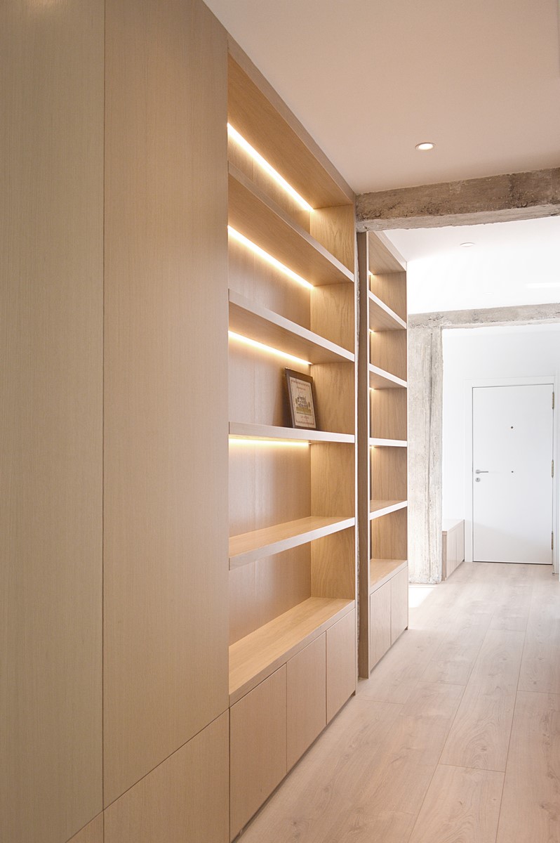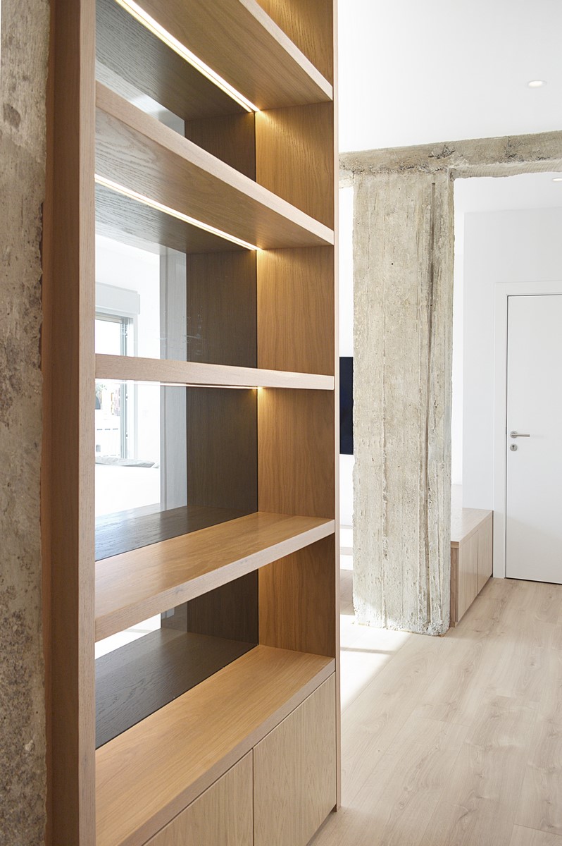 La vivienda se desarrolla a través de un gran elemento lineal a modo de biblioteca que articula el espacio de día y de noche de la vivienda.
