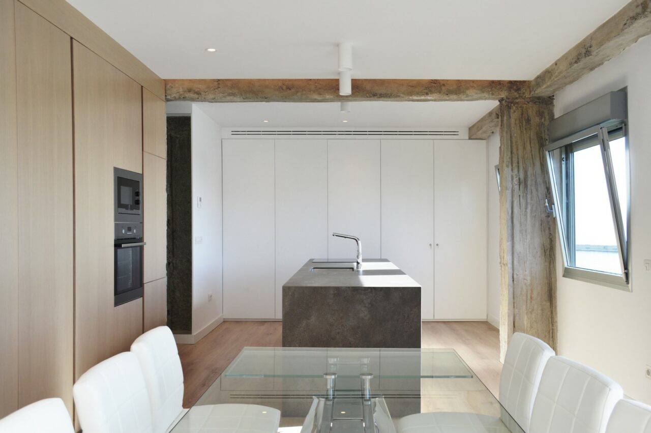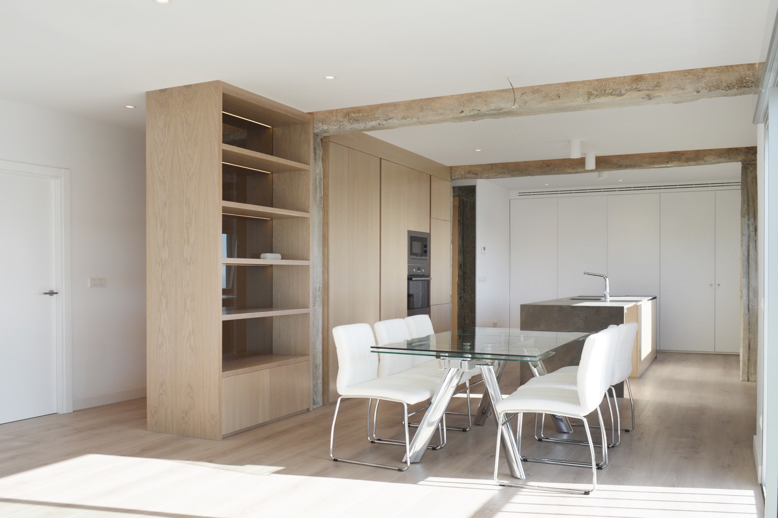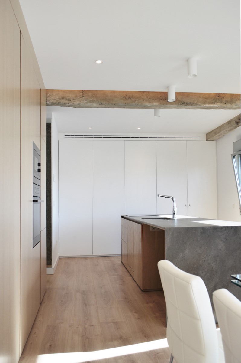 La cocina se plantea integrada en el salón donde la isla forma parte del mobiliario. Los módulos altos de la cocina estructuran el hall del entrada minimizando las visiones hacia la cocina desde el acceso a la vivienda.