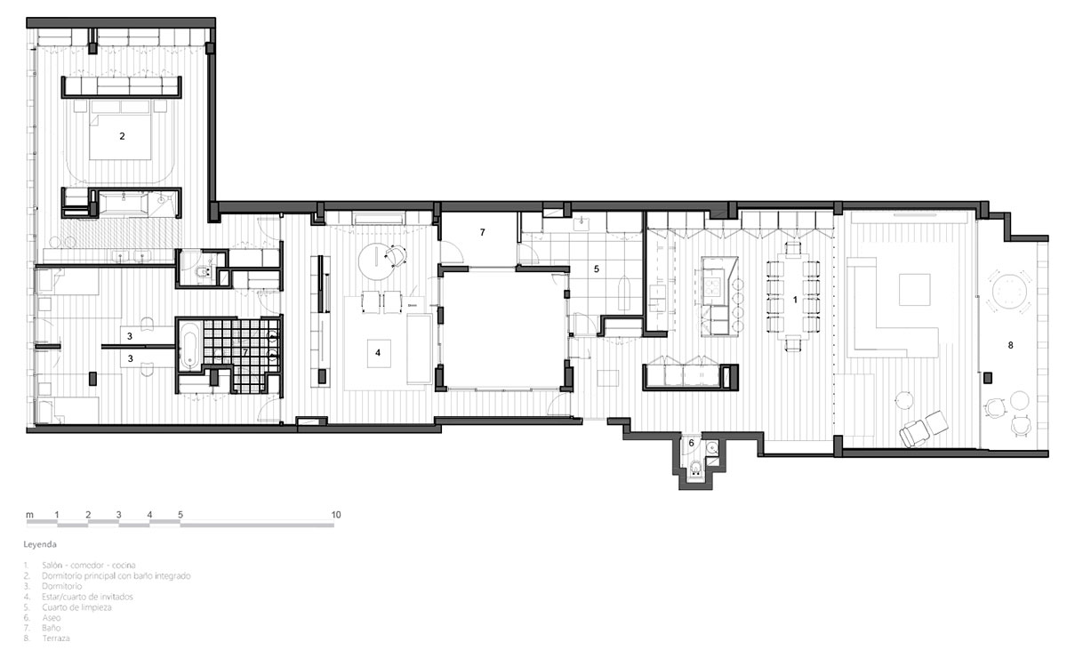 La propuesta parte de la premisa de minimizar las zonas de circulación y potenciar la luz natural, se proponen estancias más diáfanas, reduciendo la compartimentación en la vivienda.