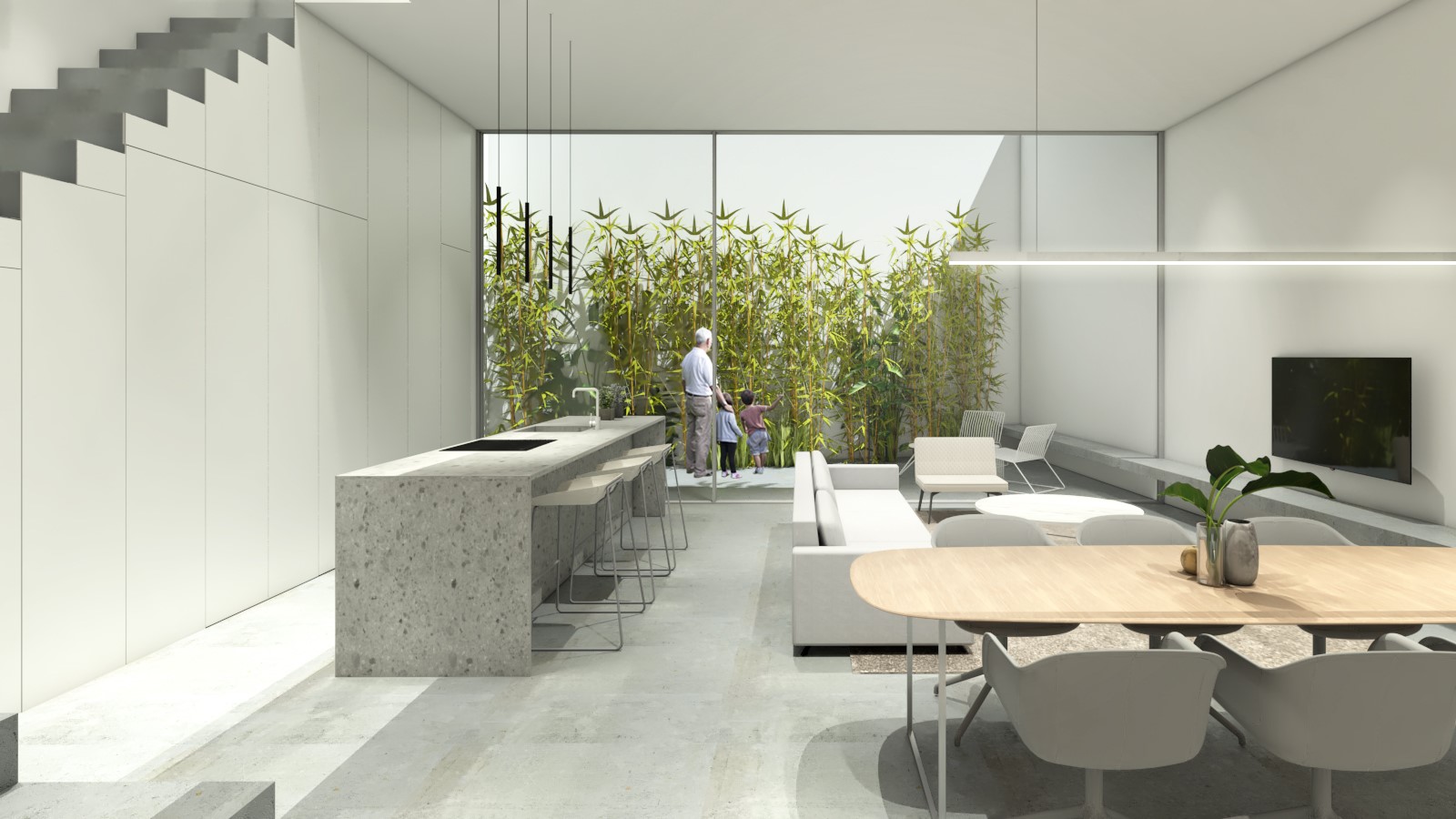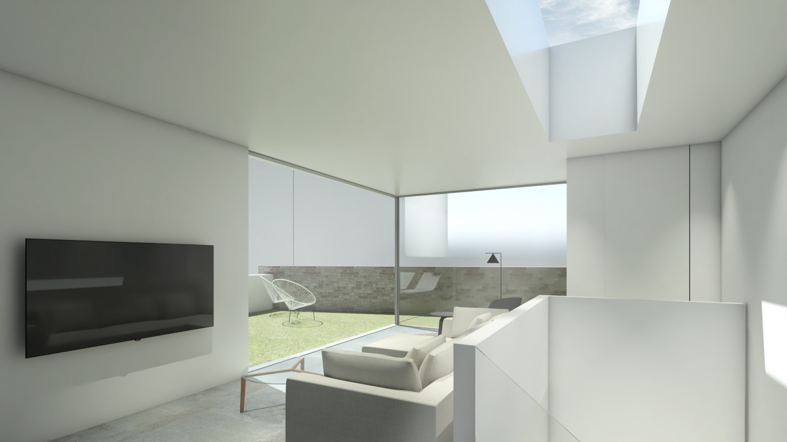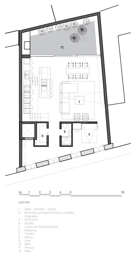 El programa, se desarrolla en 3 niveles. En el primer nivel, se desarrollan todas las zonas comunes, salón, comedor y cocina en un espacio diáfano, que se abre con un gran ventanal hacia el patio trasero. Se realiza ese patio aprovechando el ancho total de la parcela, creando así un telón de fondo vegetal para el espacio de día. Esta área de acceso recuperará el pavimento hidráulico original de las dos viviendas, para combinarlo con la solera de hormigón armado.