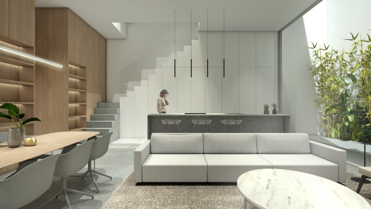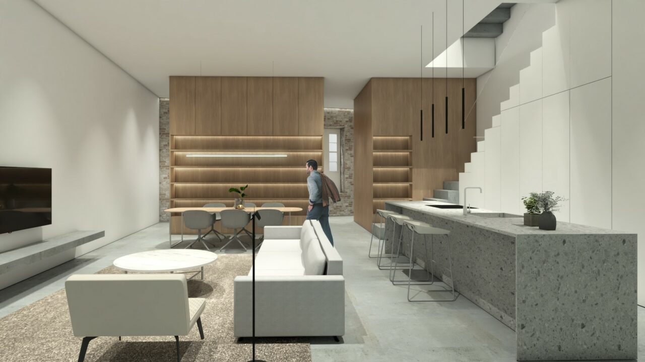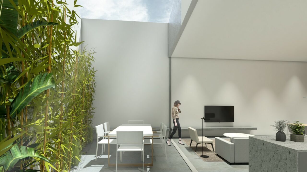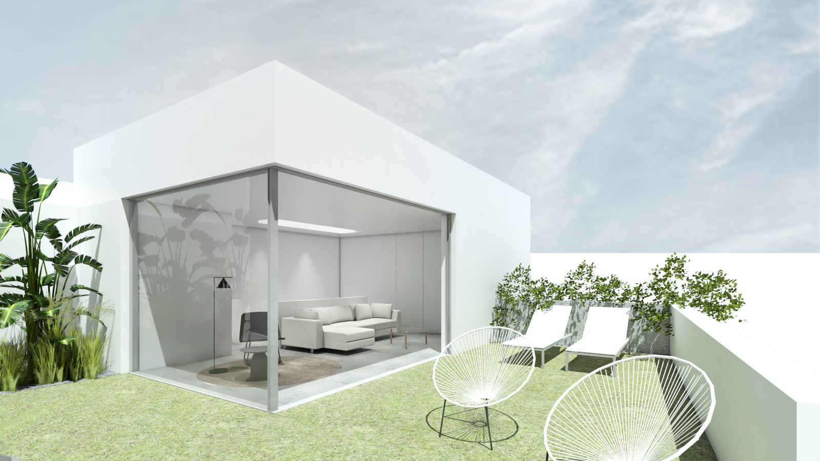 El programa, se desarrolla en 3 niveles. En el primer nivel, se desarrollan todas las zonas comunes, salón, comedor y cocina en un espacio diáfano, que se abre con un gran ventanal hacia el patio trasero. Se realiza ese patio aprovechando el ancho total de la parcela, creando así un telón de fondo vegetal para el espacio de día. Esta área de acceso recuperará el pavimento hidráulico original de las dos viviendas, para combinarlo con la solera de hormigón armado.