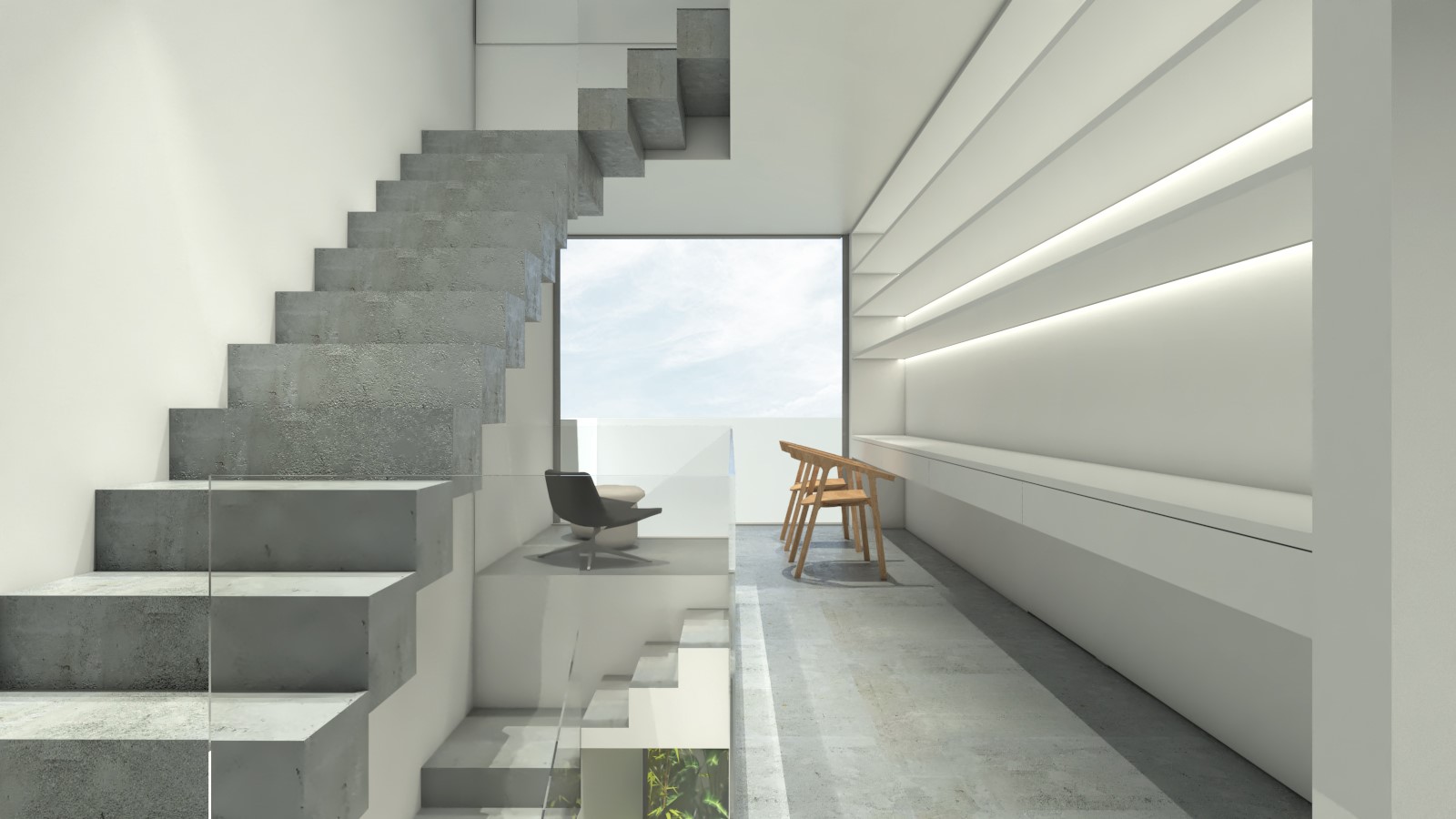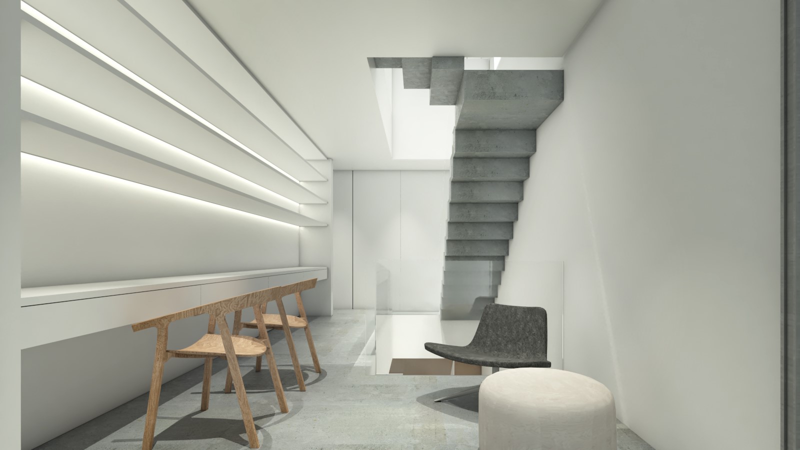 En el primer nivel, una escalera de hormigón visto permitirá el acceso a la segunda planta, la zona de noche. En esta planta se ubica una gran zona de estudio/biblioteca, dos dormitorios sencillos con un baño para compartir y un dormitorio suite con vestidor y baño en su interior.