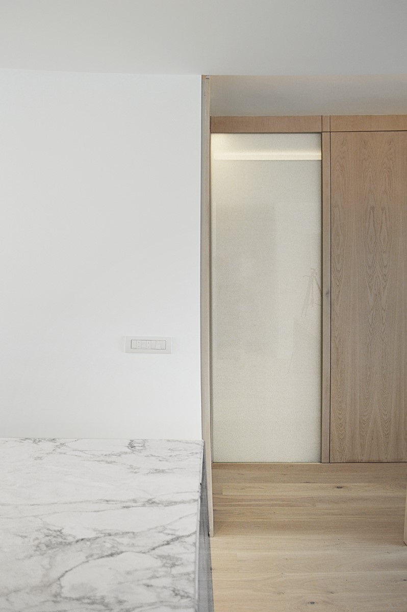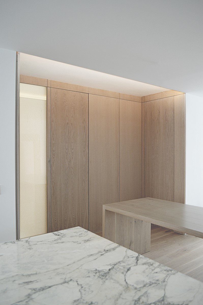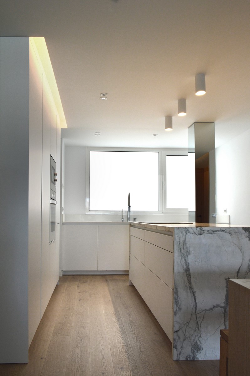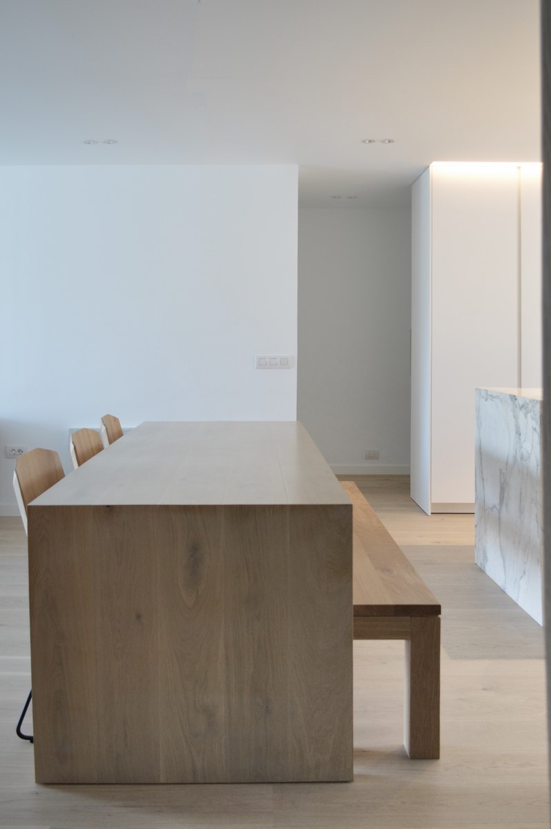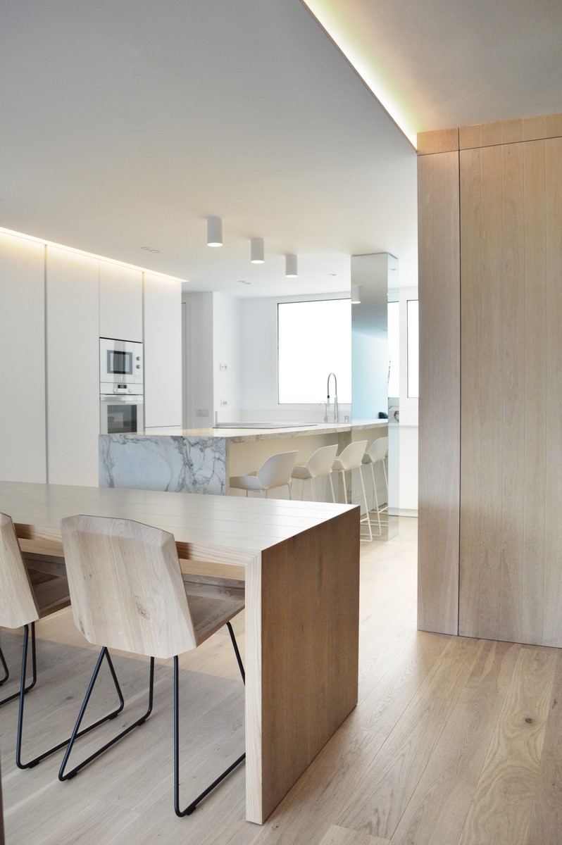 La utilización de elementos neutros y claros constituyen la base de la propuesta. El roble del pavimento aporta calidez a la vivienda. Materiales como el mármol carrara en el baño o la isla aportan riqueza y textura a la pureza del espacio.