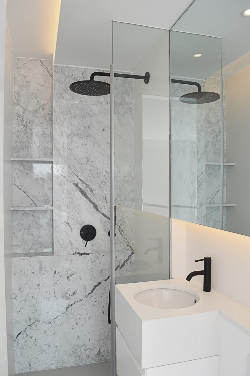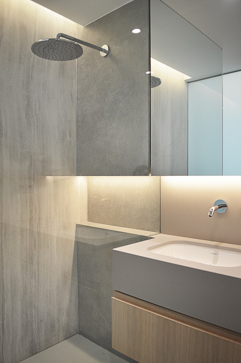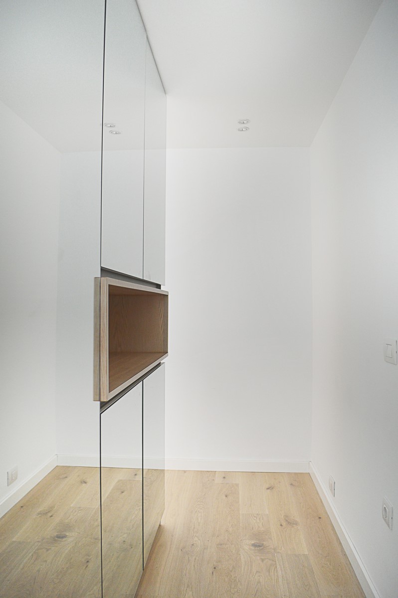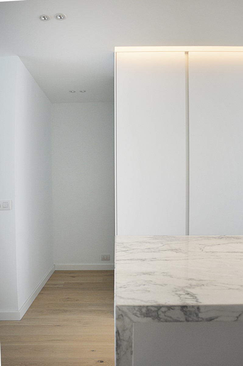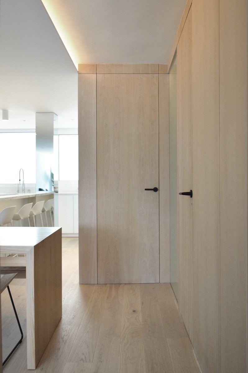La utilización de elementos neutros y claros constituyen la base de la propuesta. El roble del pavimento aporta calidez a la vivienda. Materiales como el mármol carrara en el baño o la isla aportan riqueza y textura a la pureza del espacio.