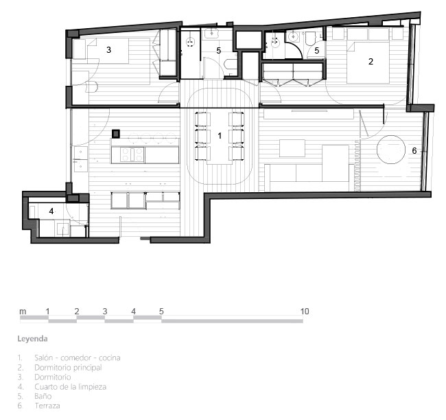 La propuesta por tanto parte de la base de generar espacios flexibles y diáfanos que amplían la sensación espacial y potencian la luz en la vivienda.