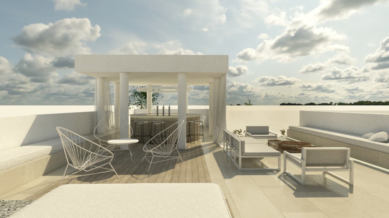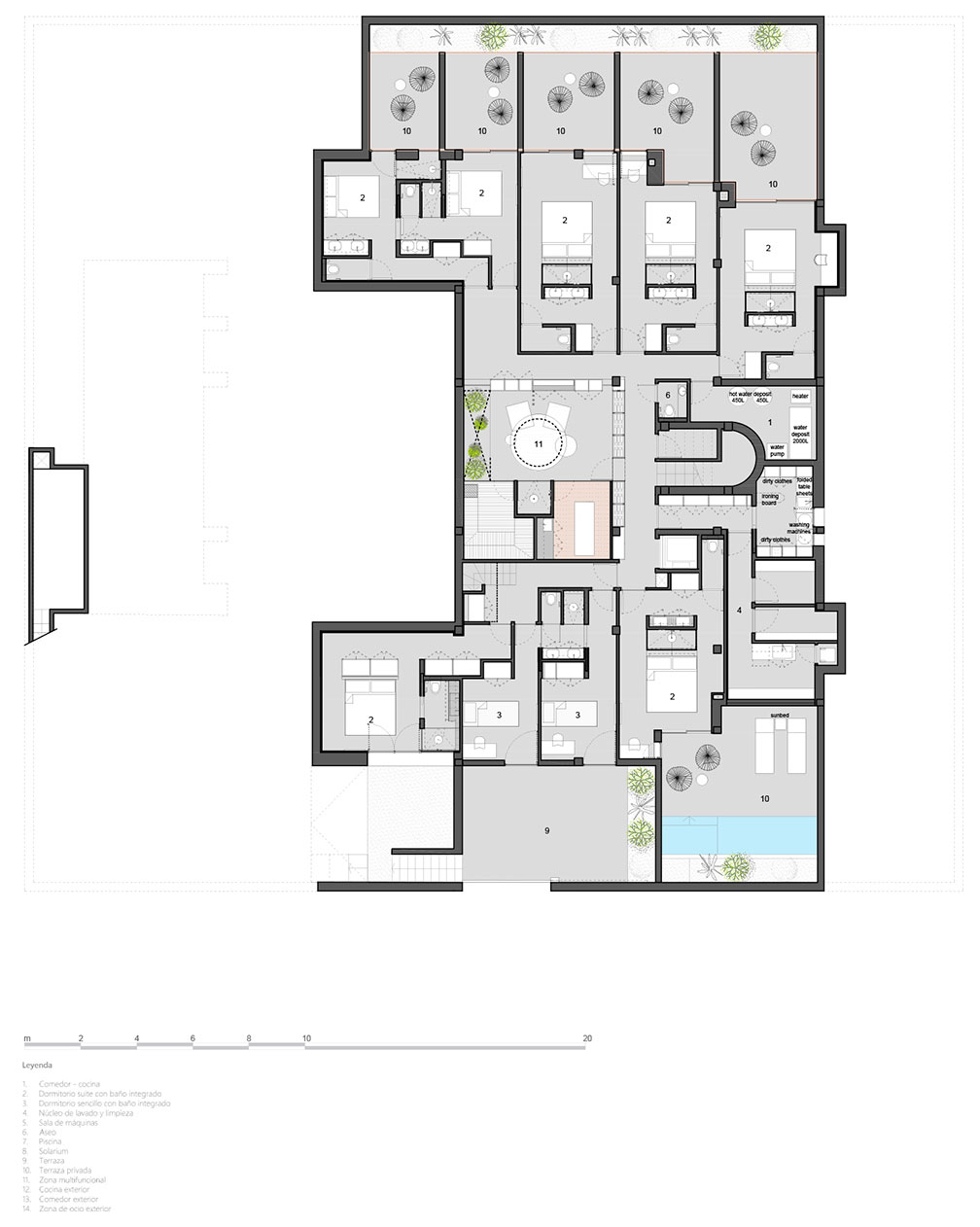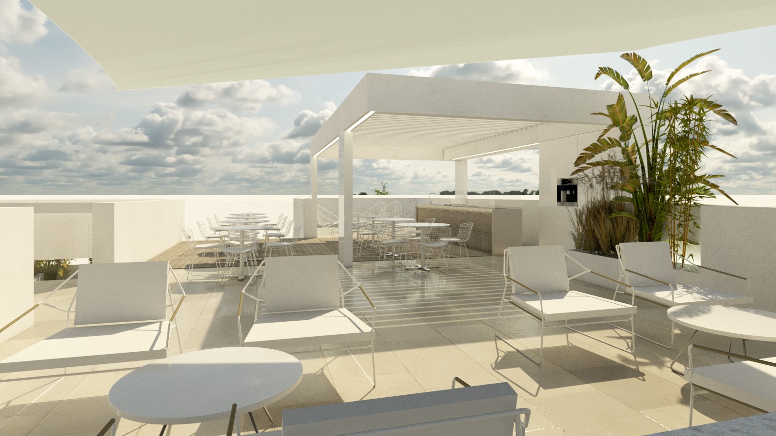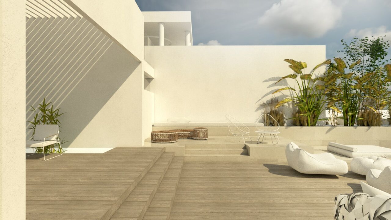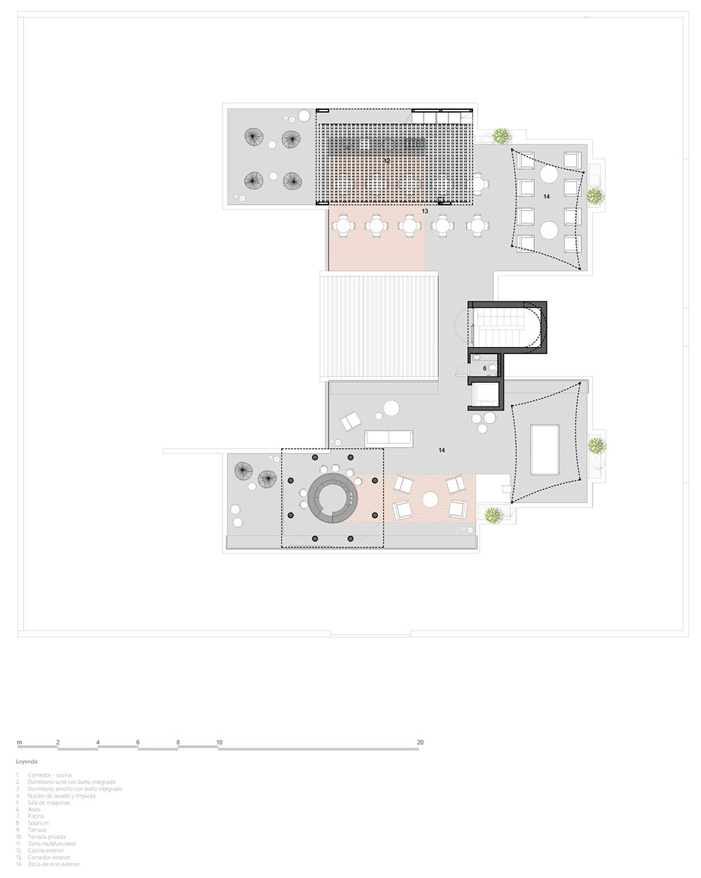 La idea del proyecto parte de la premisa de generar espacios exteriores que se relacionen de manera directa con el interior de la vivienda. La cubierta del edificio se plantea como un lugar de ocio de todo el conjunto.