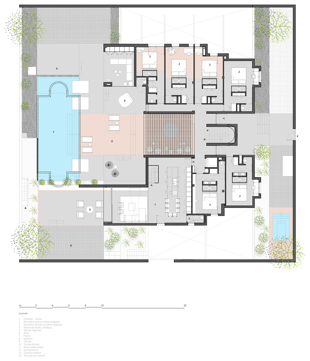 Las zonas de día de la vivienda se desarrollan en el nivel superior (contacto con la calle) y las zonas de noche de la vivienda en el nivel inferior en contacto con patios ajardinados.
