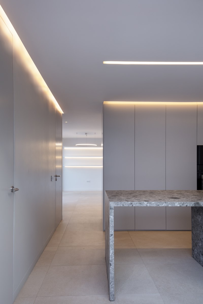 La iluminación interior se diseña con iluminación indirecta lineal, apoyada por luminarias puntuales integradas de haz invisible.