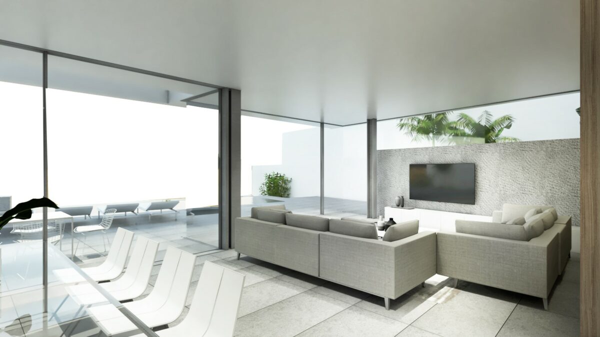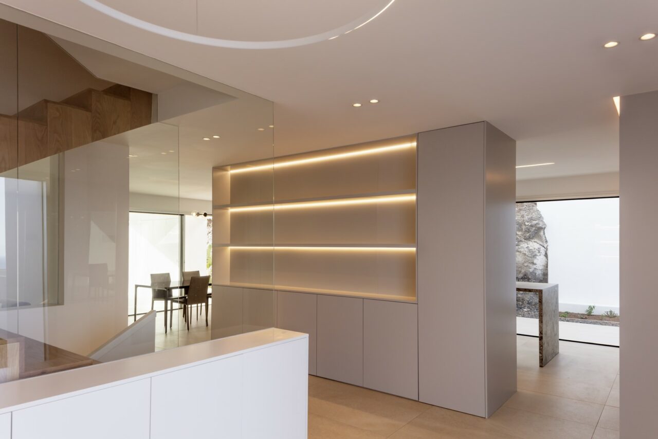 La zona de día de la vivienda se relaciona directamente con el jardín trasero y la piscina. Se plantea un espacio diáfano que gira en torno a un elemento central. Este elemento central resuelve por un lado las circulaciones a través de una gran biblioteca y por el otro la cocina. El espacio de salón y comedor se relaciona con el exterior a través de grandes puertas correderas, con esto conseguimos que el interior y el exterior de la vivienda, se fundan en un único espacio. La isla de la cocina se plantea como una gran pieza escultórica, un material pétreo con mucha textura que aporta carácter al espacio.