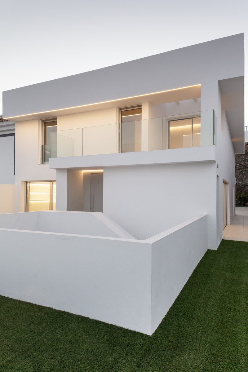 El tratamiento de la envolvente es coherente con su interior, siendo muy cerrado en el sentido lateral, generando la mayor privacidad posible con la parcela contigua y abierto en el sentido transversal con grandes acristalamientos que permiten la relación del interior con las vistas y los espacios exteriores.