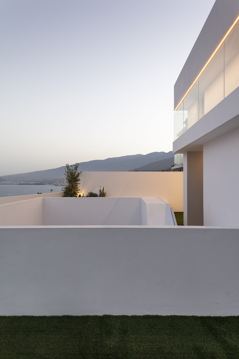 El plano horizontal se resuelve mediante pavimento pétreo de gran formato, con continuidad interior y exterior, salvando los grandes ventanales que quedan integrados bajo el nivel del pavimento. En el interior, todos los paramentos verticales aparecen en blanco, en contraste con el fondo verde que provocan el jardín exterior.