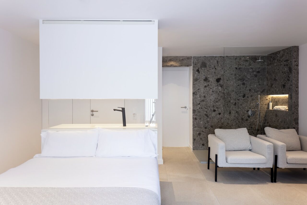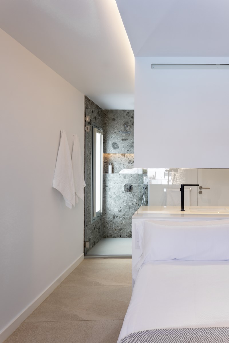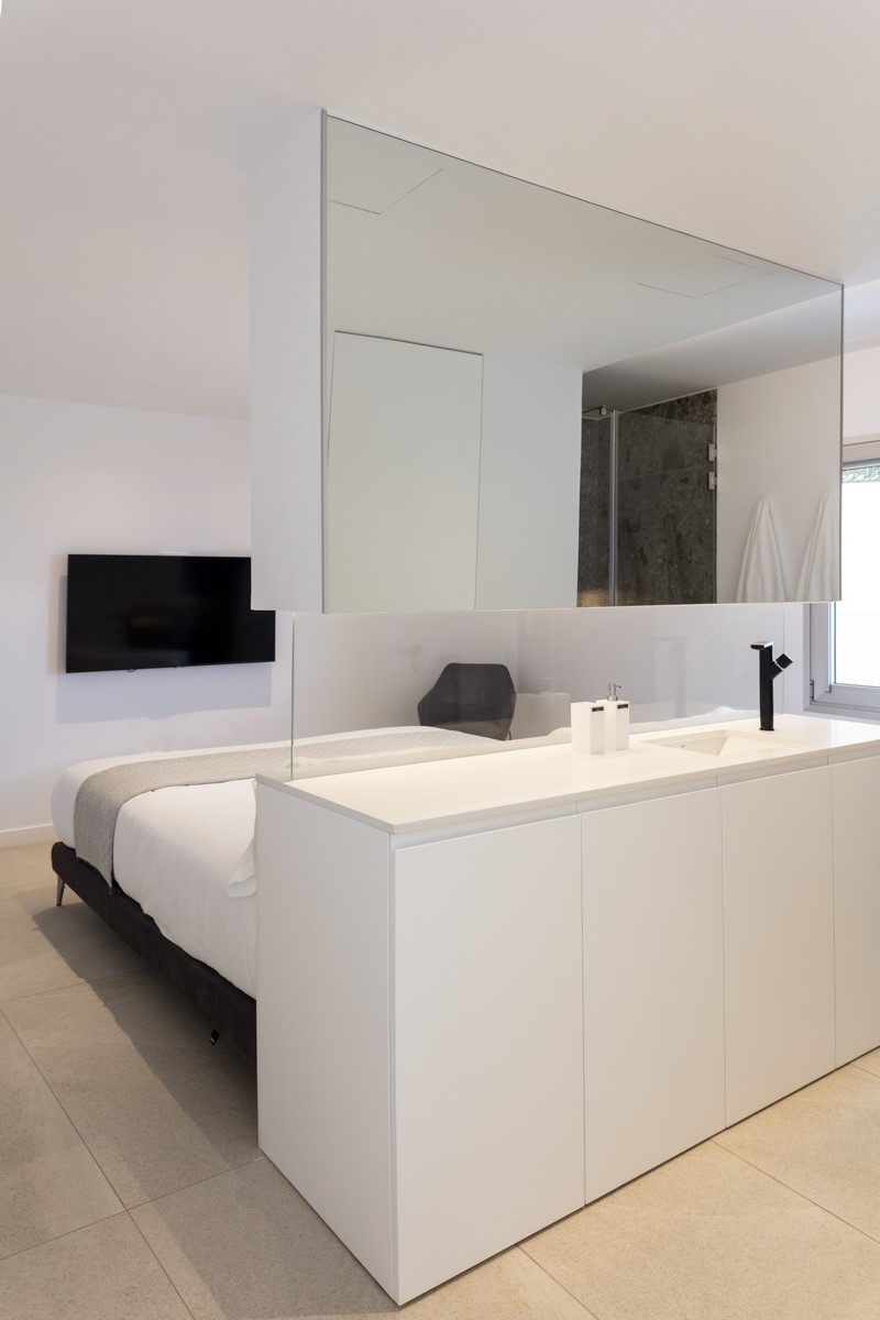 En la zona de noche de la vivienda se desarrolla una gran suite con vistas al mar y dos habitaciones relacionadas con el jardín y la piscina.