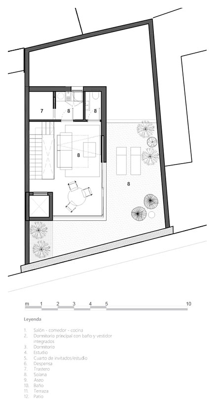 La vivienda se desarrolla en tres niveles, en el primer nivel en contacto con la calle, se desarrolla el aparcamiento y los espacios de almacenamiento, en el segundo nivel se desarrolla el espacio de día de la vivienda junto con las zonas exteriores y en el tercer nivel se desarrollan las habitaciones.