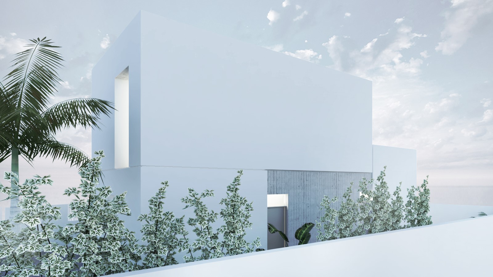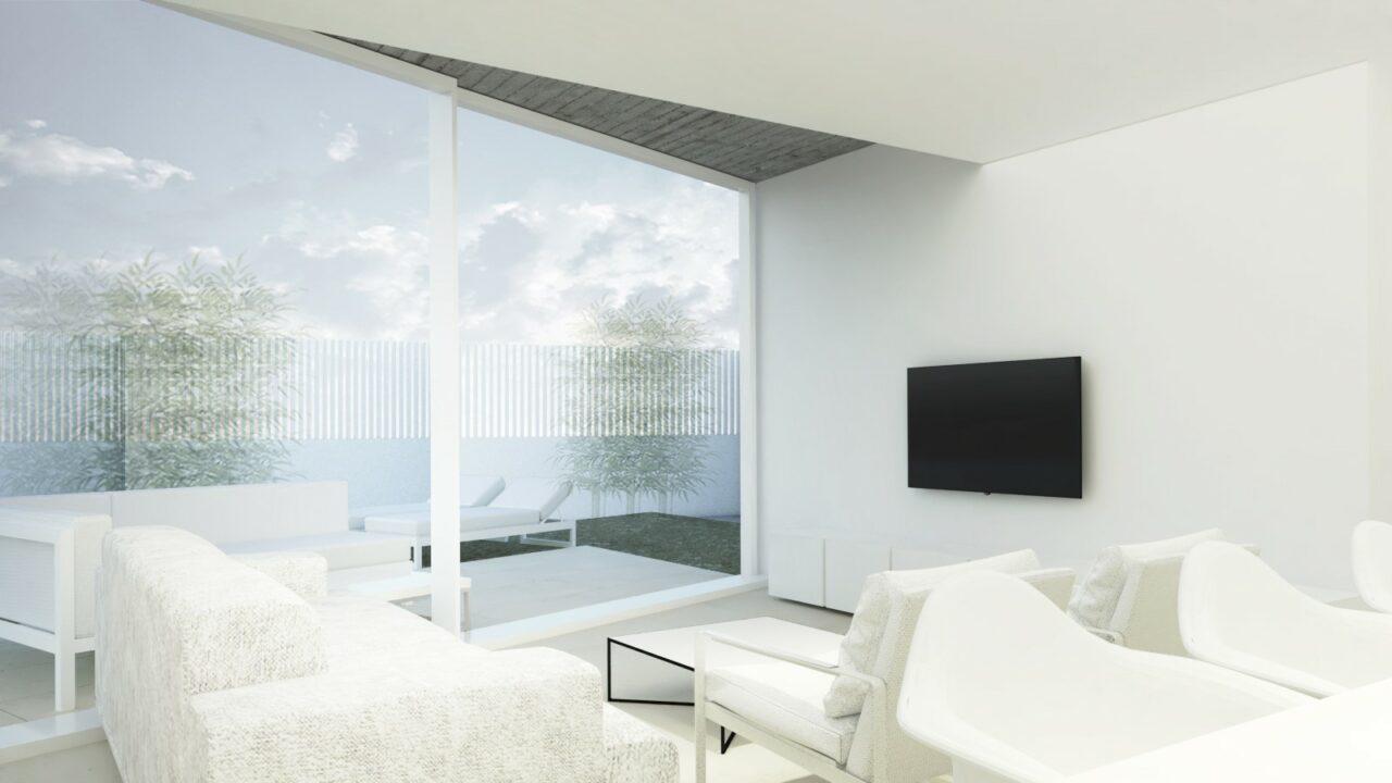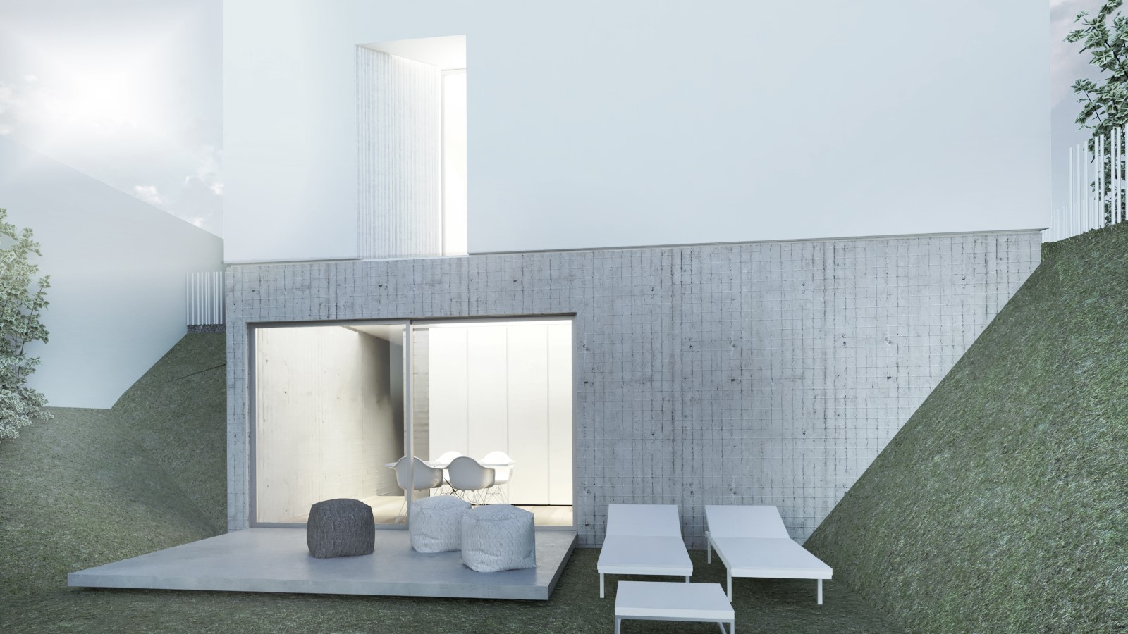 Los estancias de noche tales como dormitorios se plantean como pliegues en la fachada minimizando al máximo la superficie de apertura. Por el contrario las zonas de día tales como salones, comedores y cocina se relacionan con los espacios abiertos de la parcela y se abren decididamente a el a través de huecos horadados en los muros de hormigón.