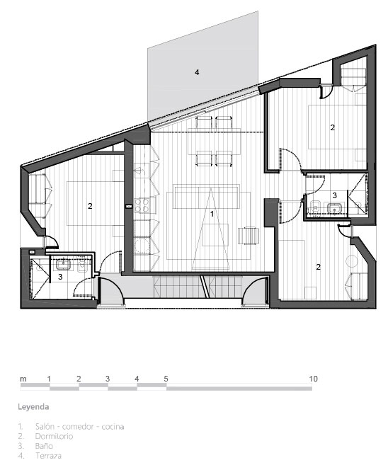 La premisa inicial del encargo fue maximizar la superficie para incluir 3 viviendas dentro de una, esto supuso un reto ya que debido al reducido espacio se tenían que resolver la intimidad entre ellas.
