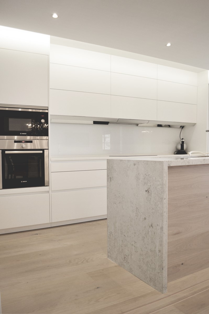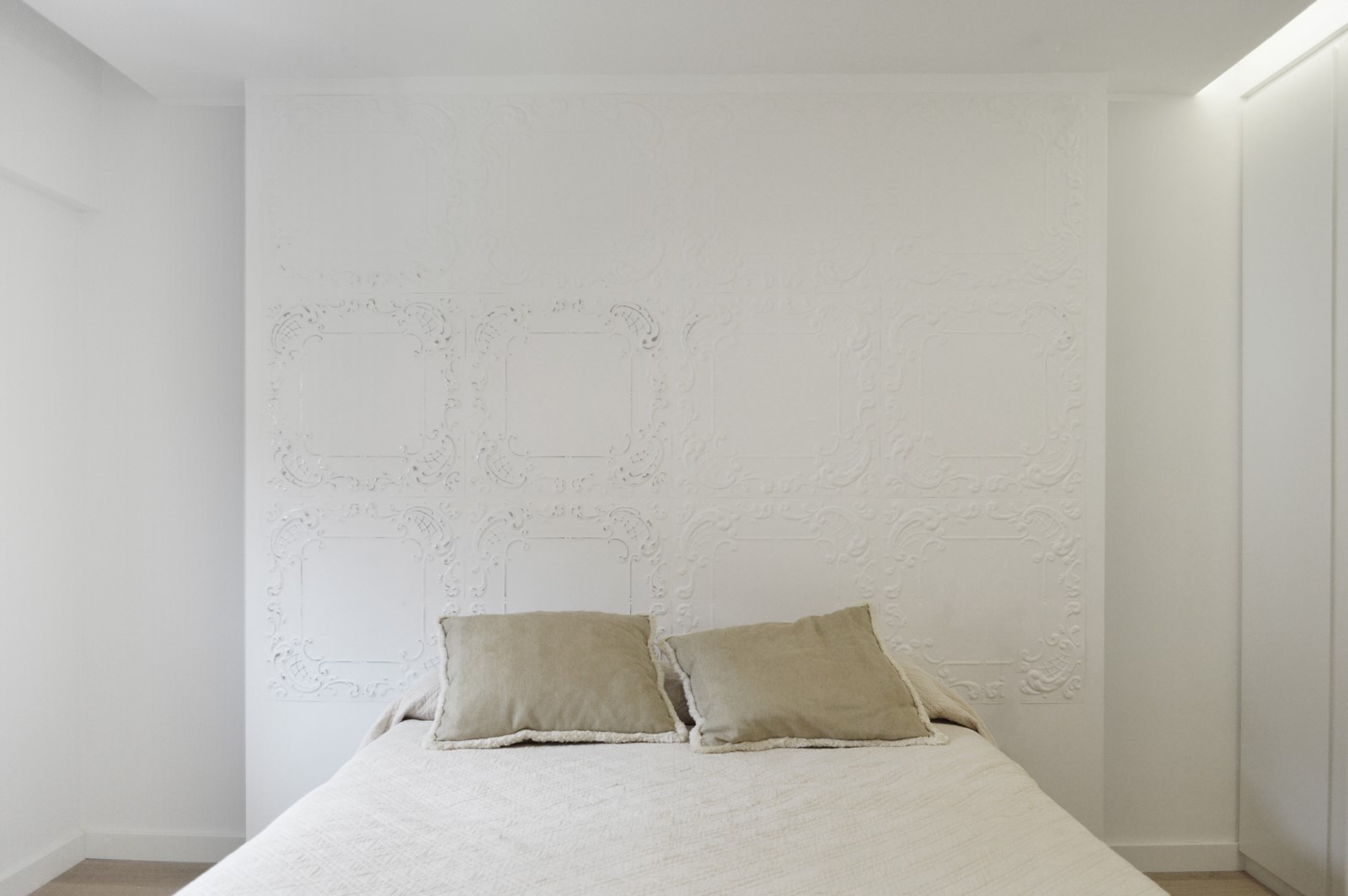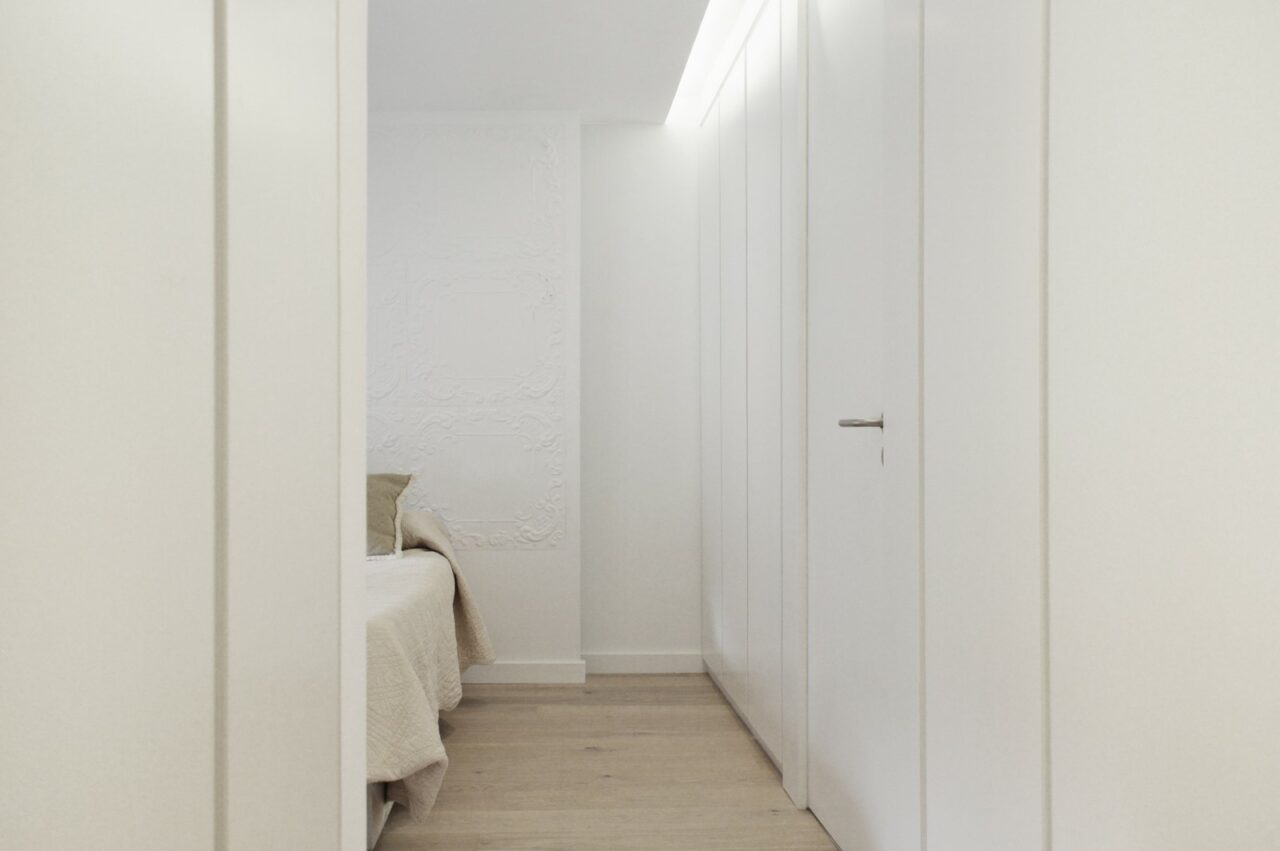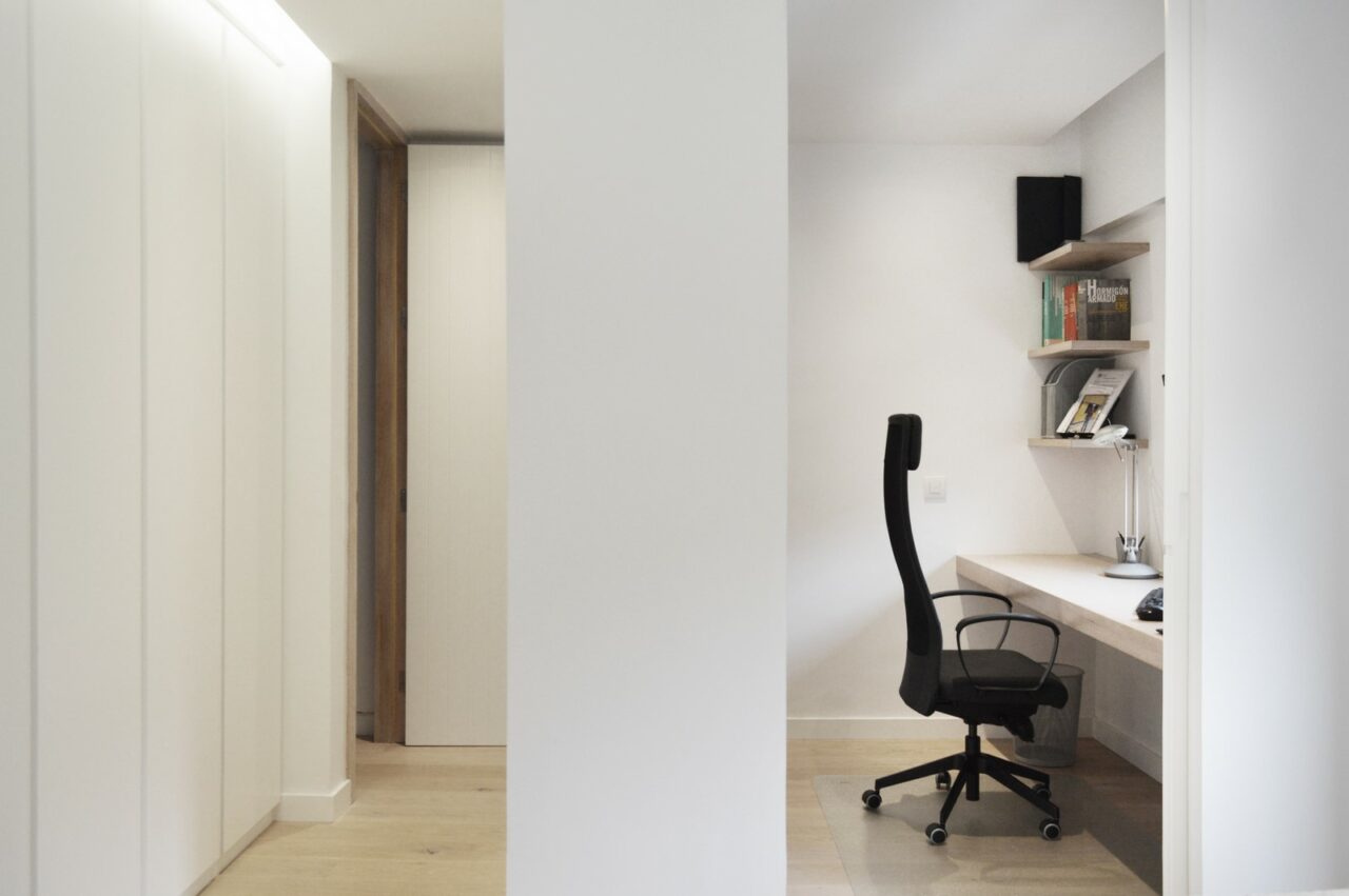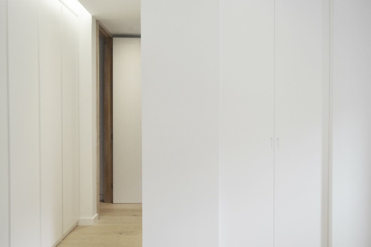 La utilización de elementos neutros y claros constituyen la base de la propuesta. El roble del pavimento aporta calidez a la vivienda. Materiales como el mármol jura gris en La cocina, el mármol carrara en el baño principal o el betone poque cerámico traído de Italia en el segundo baño aportan riqueza y textura a la pureza del entorno.