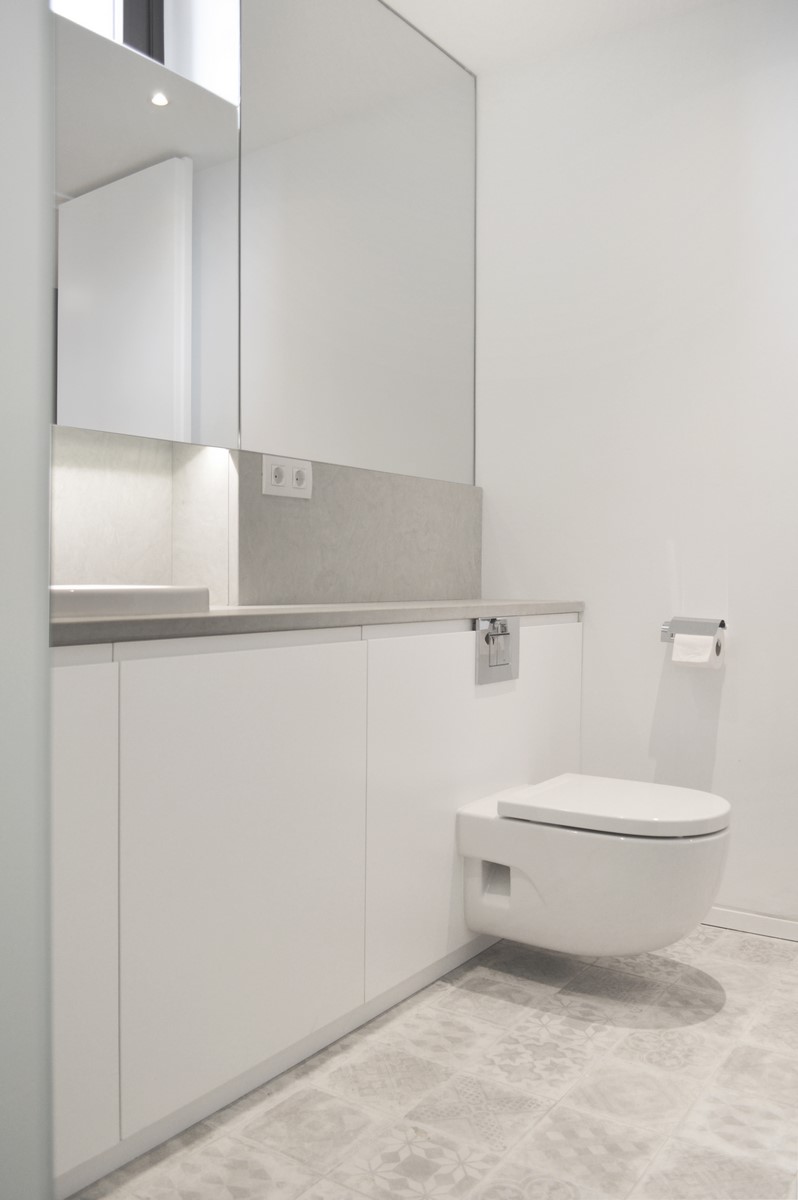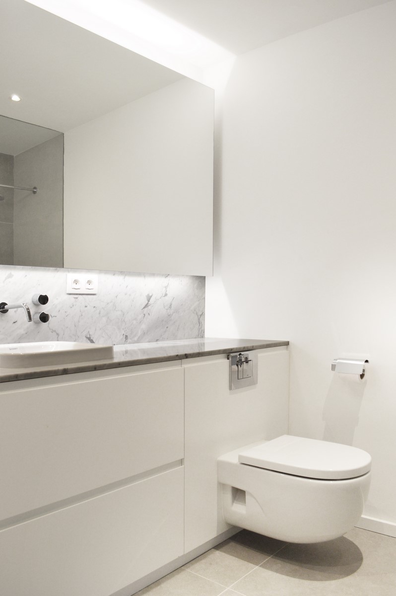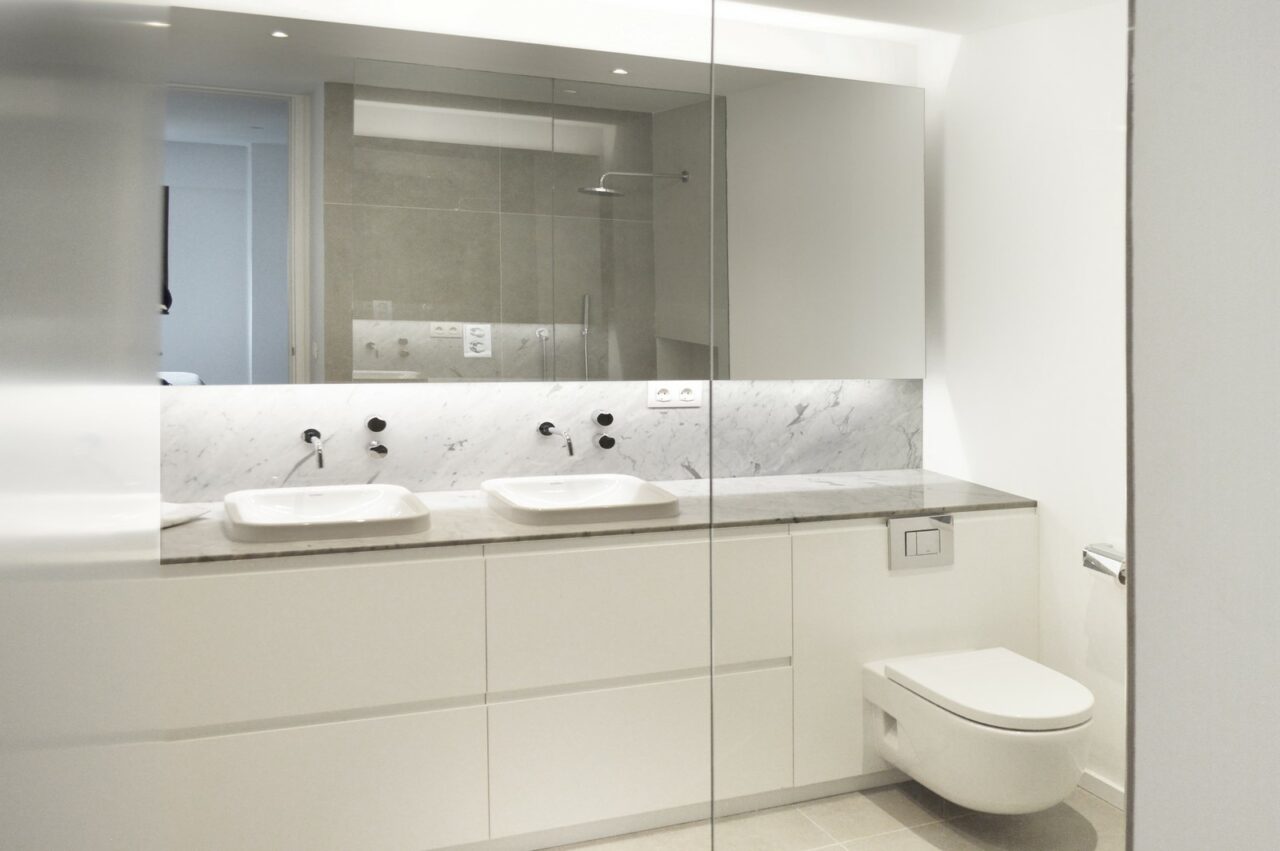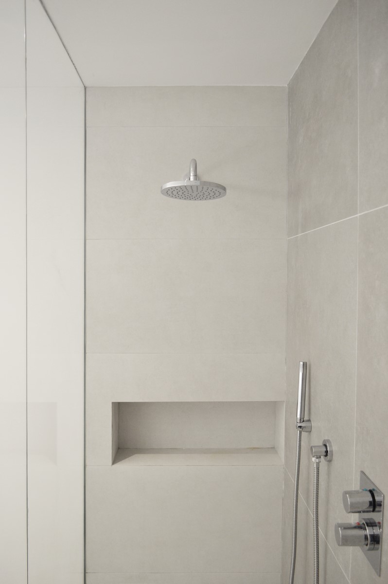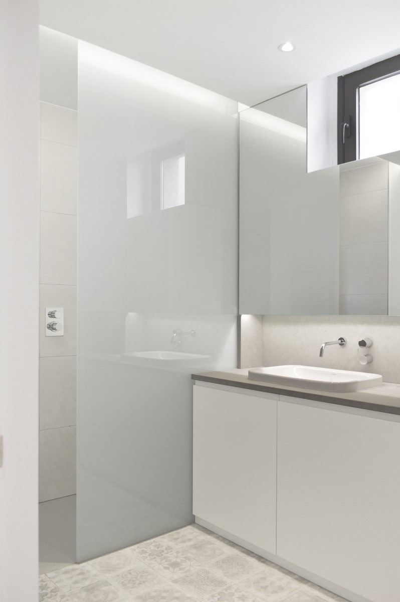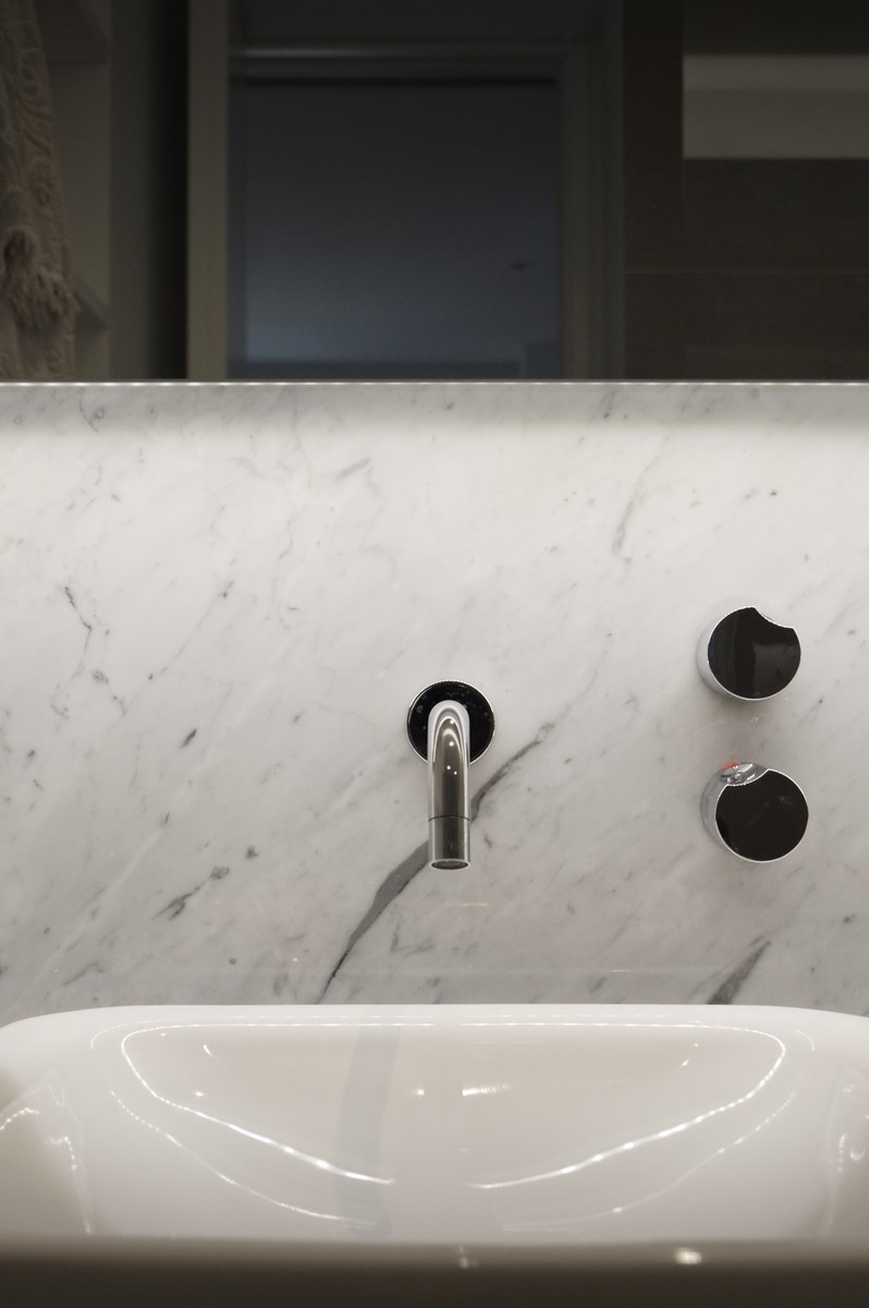 La utilización de elementos neutros y claros constituyen la base de la propuesta. El roble del pavimento aporta calidez a la vivienda. Materiales como el mármol jura gris en La cocina, el mármol carrara en el baño principal o el betone poque cerámico traído de Italia en el segundo baño aportan riqueza y textura a la pureza del entorno.