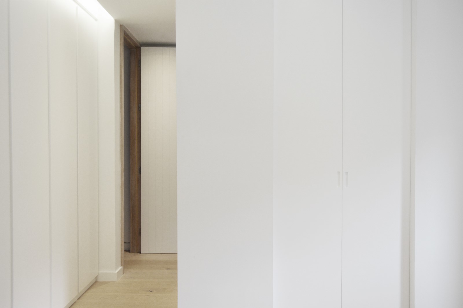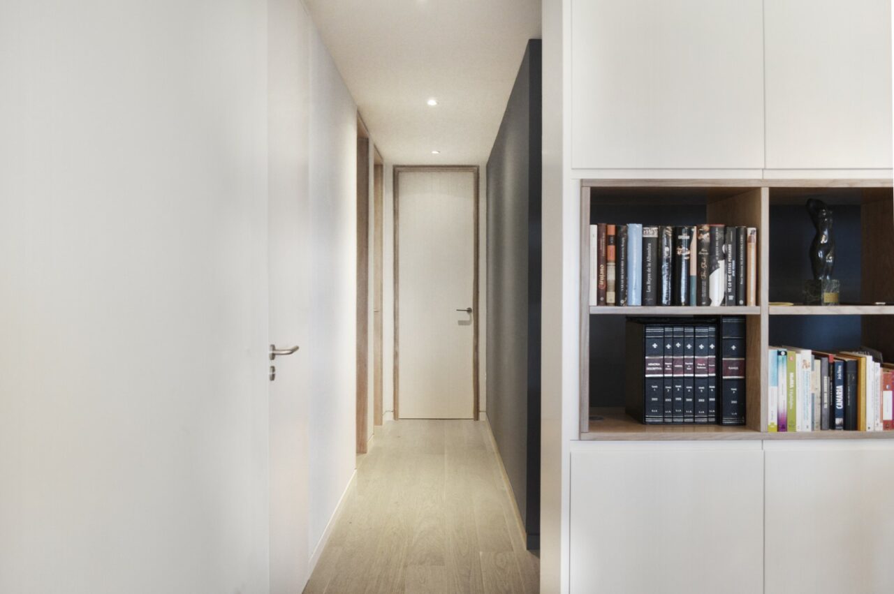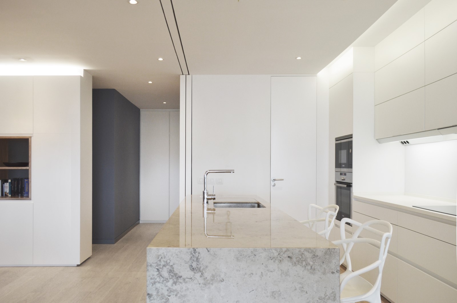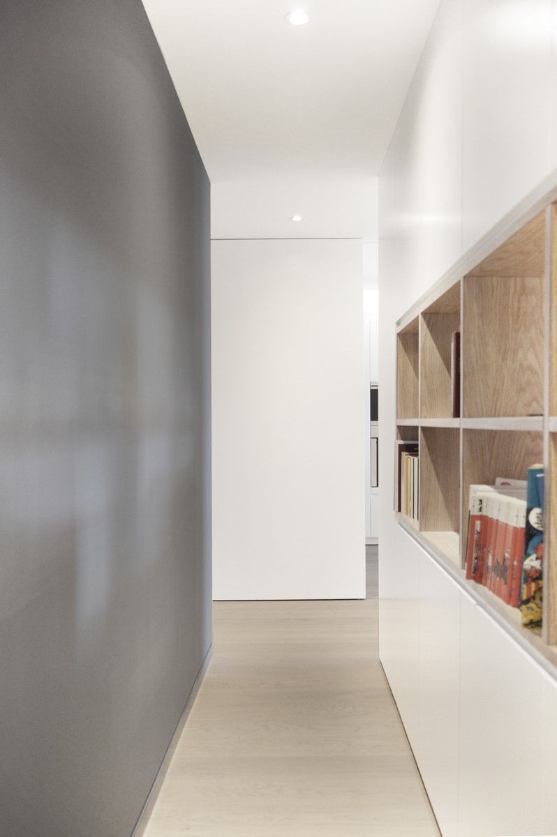 La cocina se plantea como un muro integrado en el salón donde la isla es parte del mobiliario. La biblioteca estructura las circulaciones de la vivienda a la vez que deja pasar luz a las zonas de distribución.