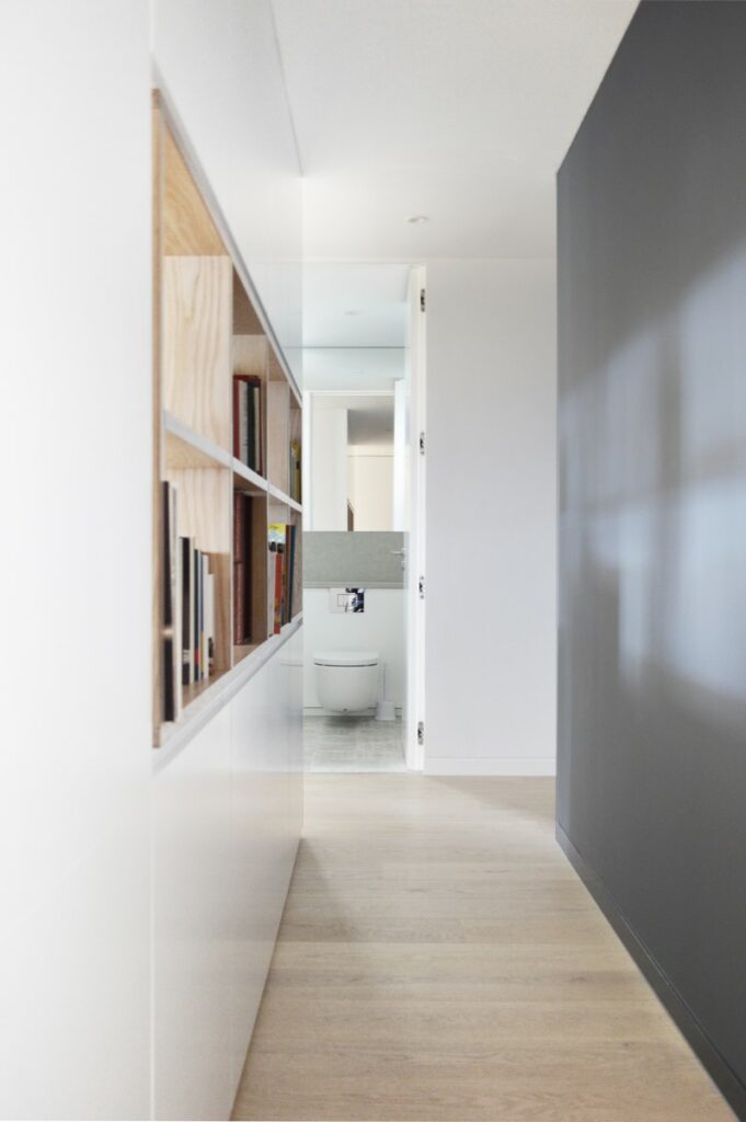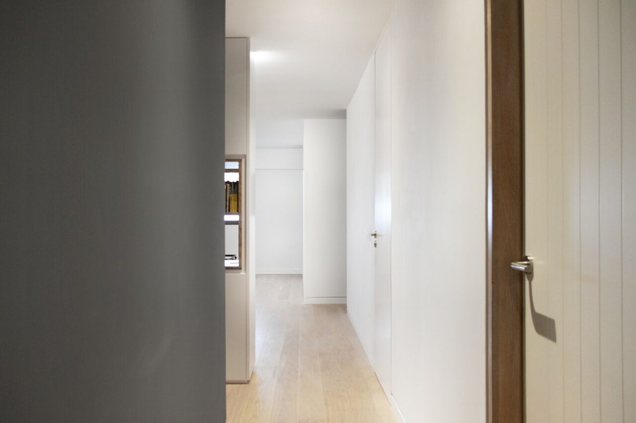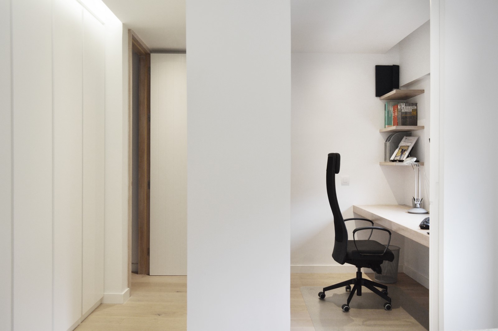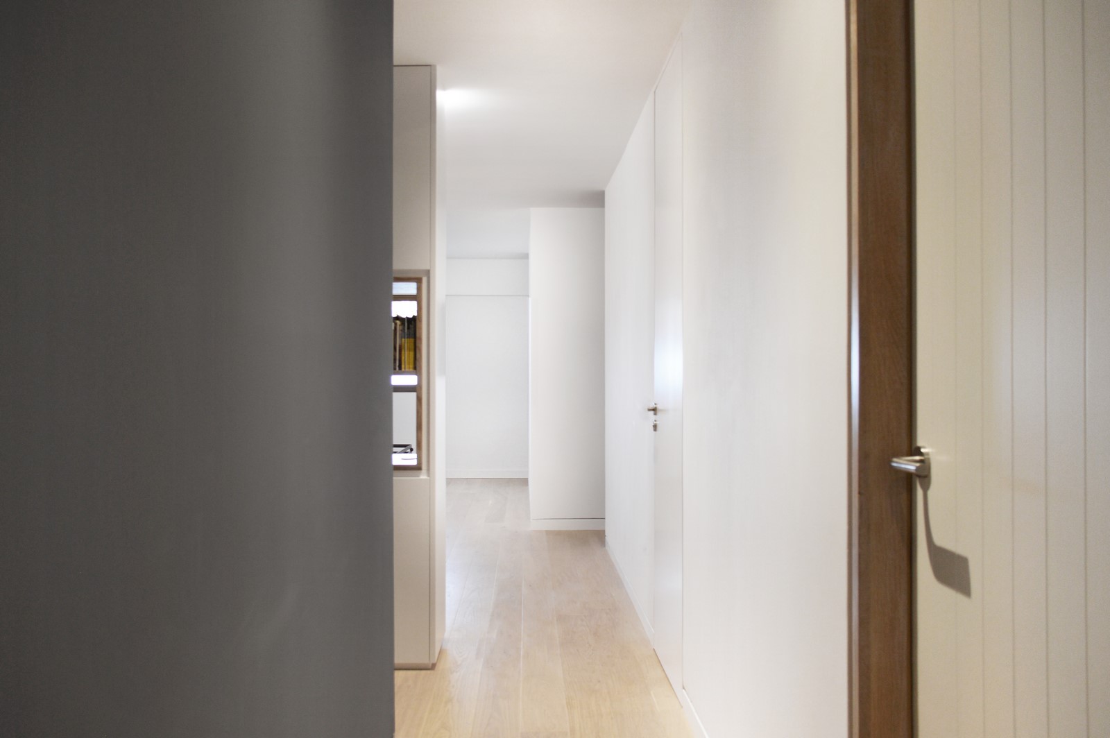 La cocina se plantea como un muro integrado en el salón donde la isla es parte del mobiliario. La biblioteca estructura las circulaciones de la vivienda a la vez que deja pasar luz a las zonas de distribución.
