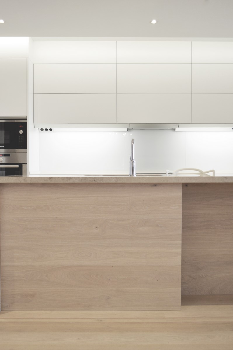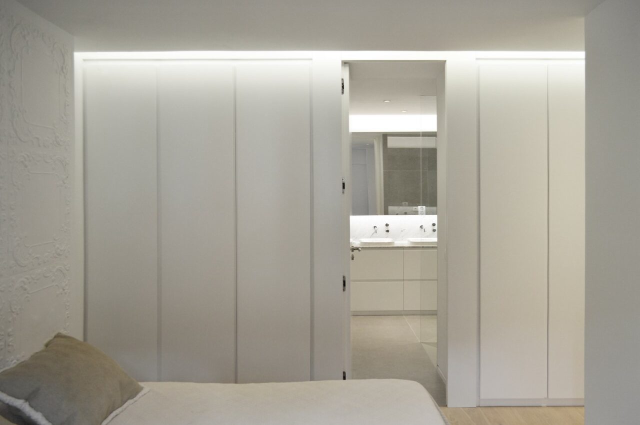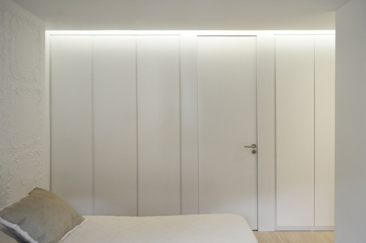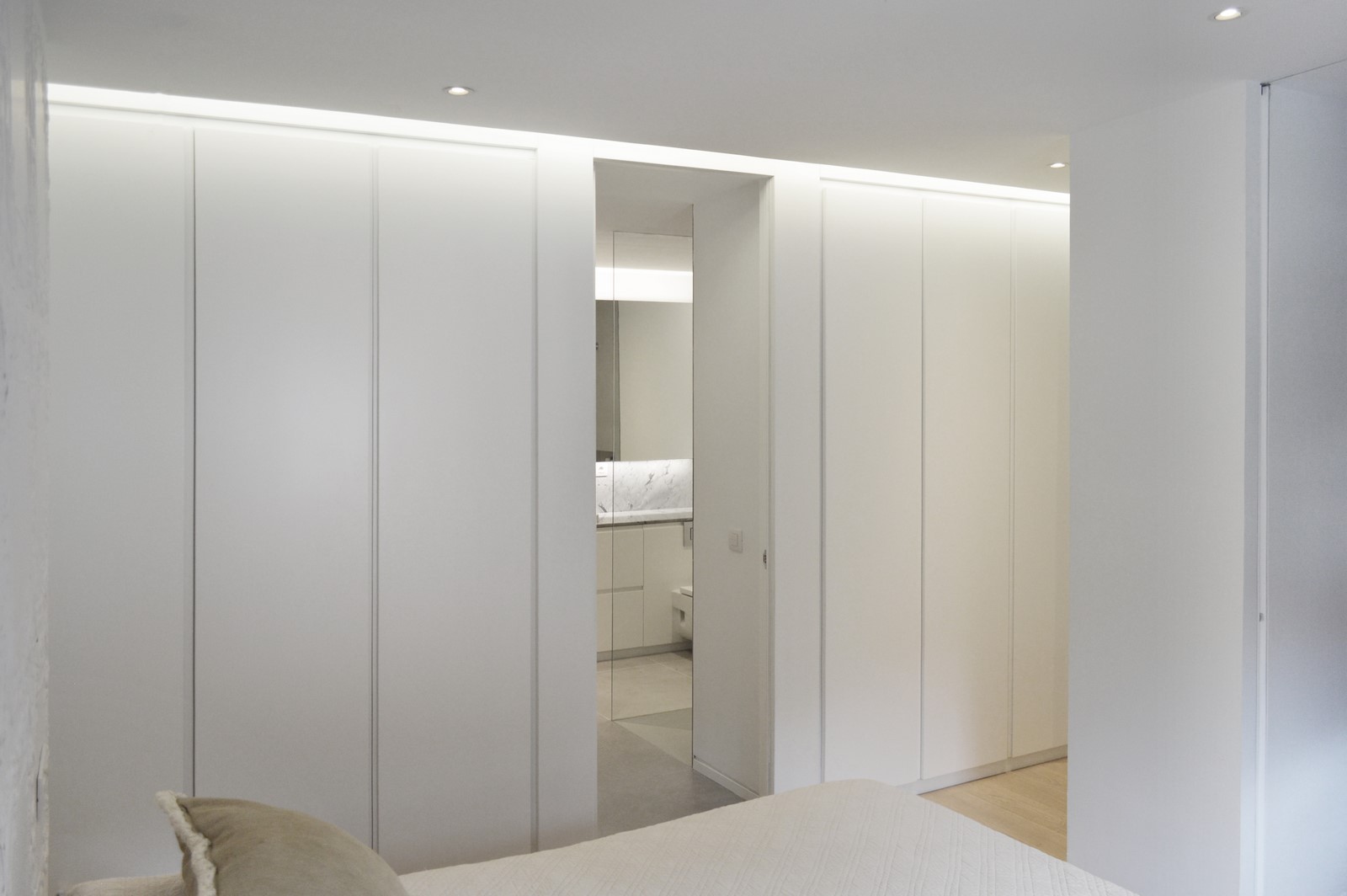 La cocina se plantea como un muro integrado en el salón donde la isla es parte del mobiliario. La biblioteca estructura las circulaciones de la vivienda a la vez que deja pasar luz a las zonas de distribución.
