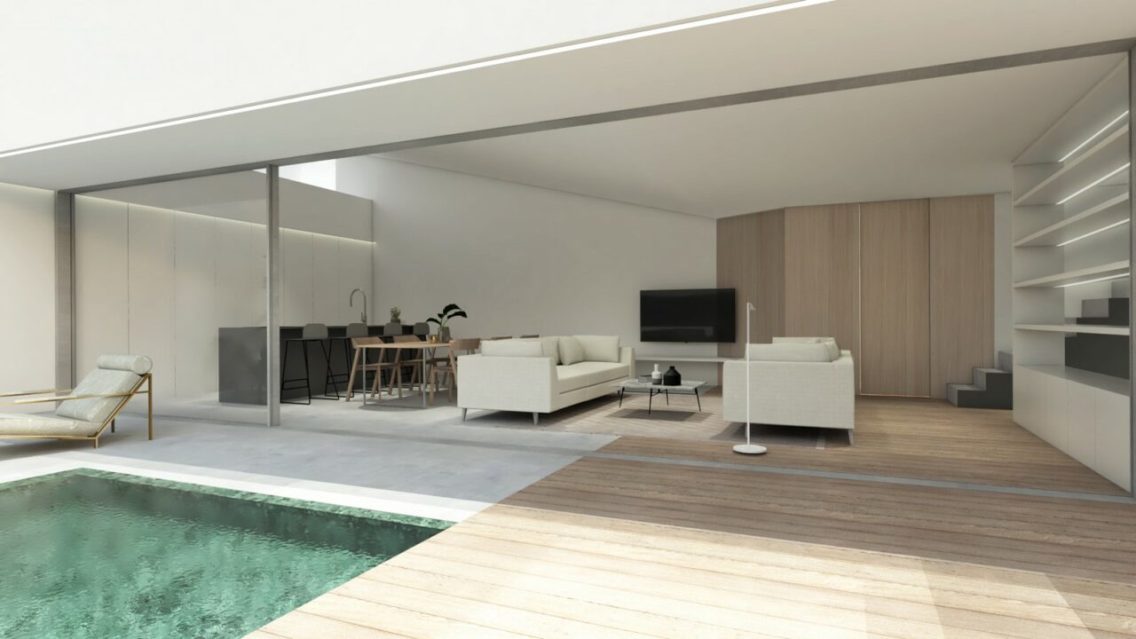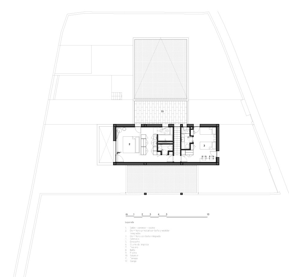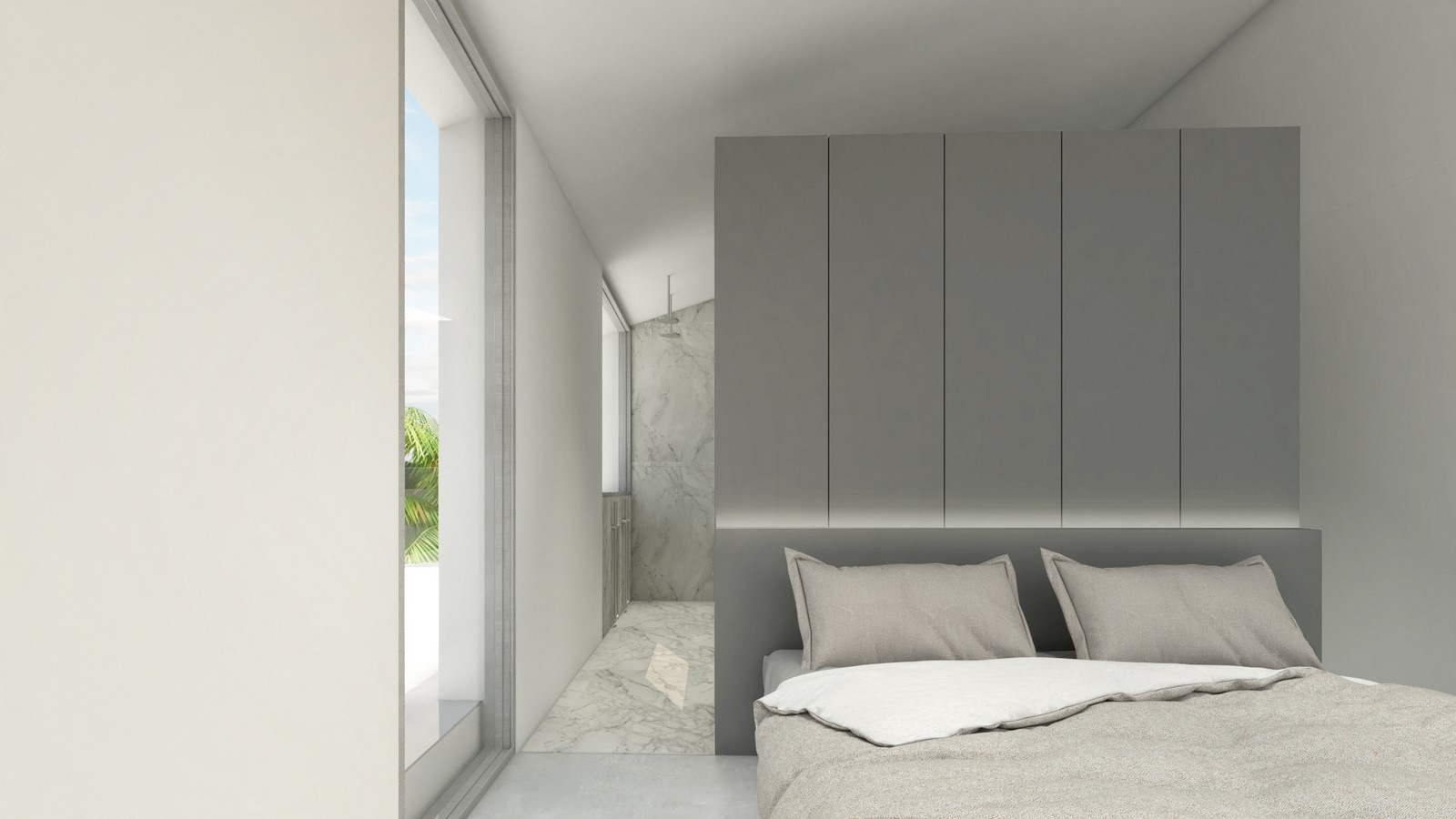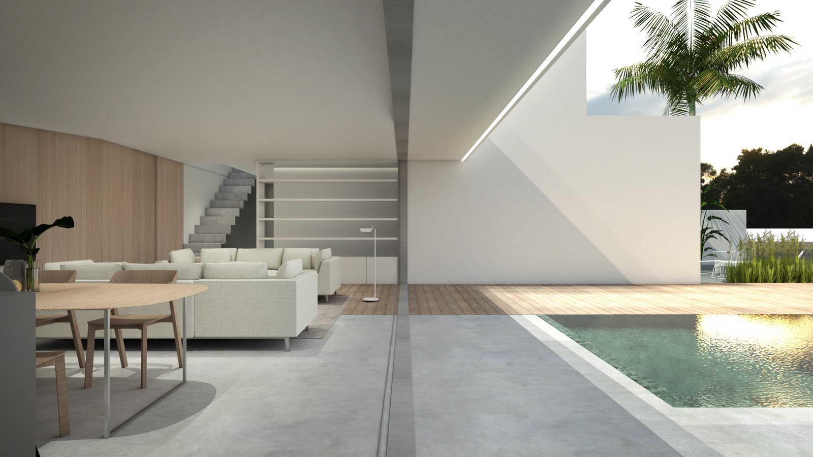 El espacio de día de la vivienda, se relaciona directamente con una plataforma exterior donde se desarrolla un gran plano de agua que se funde con el mar y las imponentes vistas del lugar. Una gran corredera tricarril permite ese contacto directo con el exterior. El espacio de trabajo y de deporte se desarrollan también en planta baja en uno de los extremos de la vivienda permitiendo más privacidad en relación con el salón-comedor-cocina. La zona de noche de la vivienda se plantea en planta alta, la suite principal se relaciona con una gran cubierta vegetal.