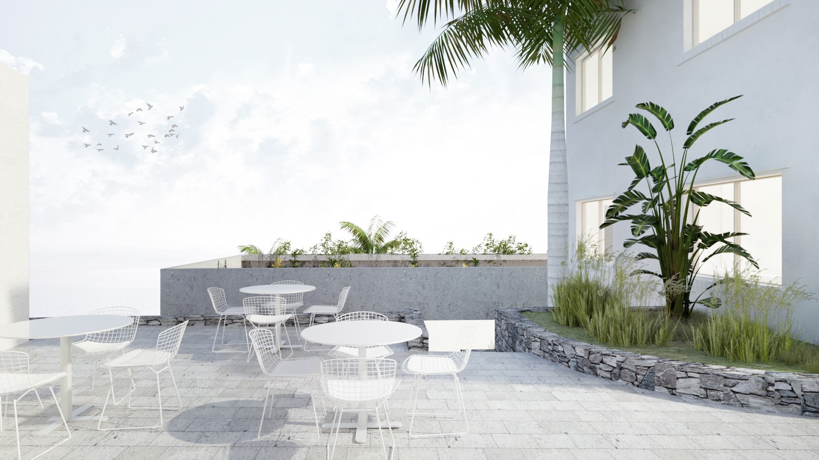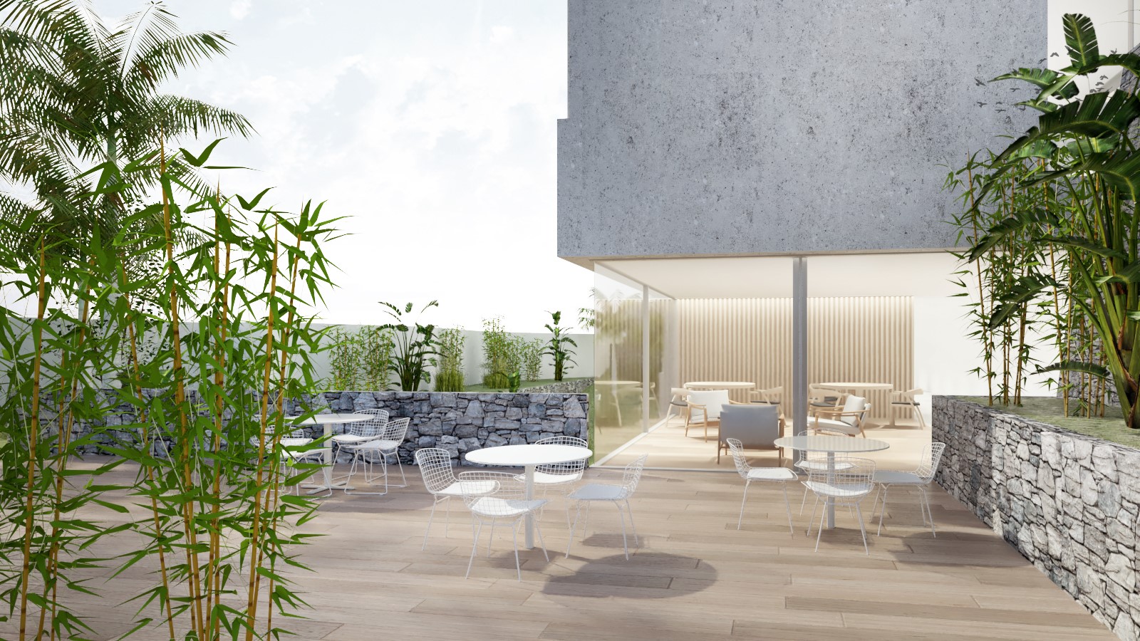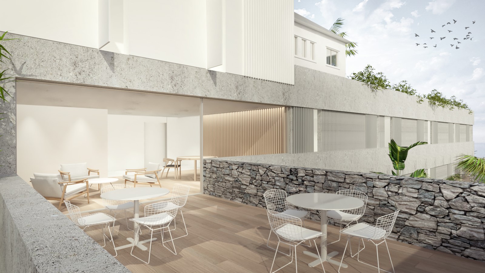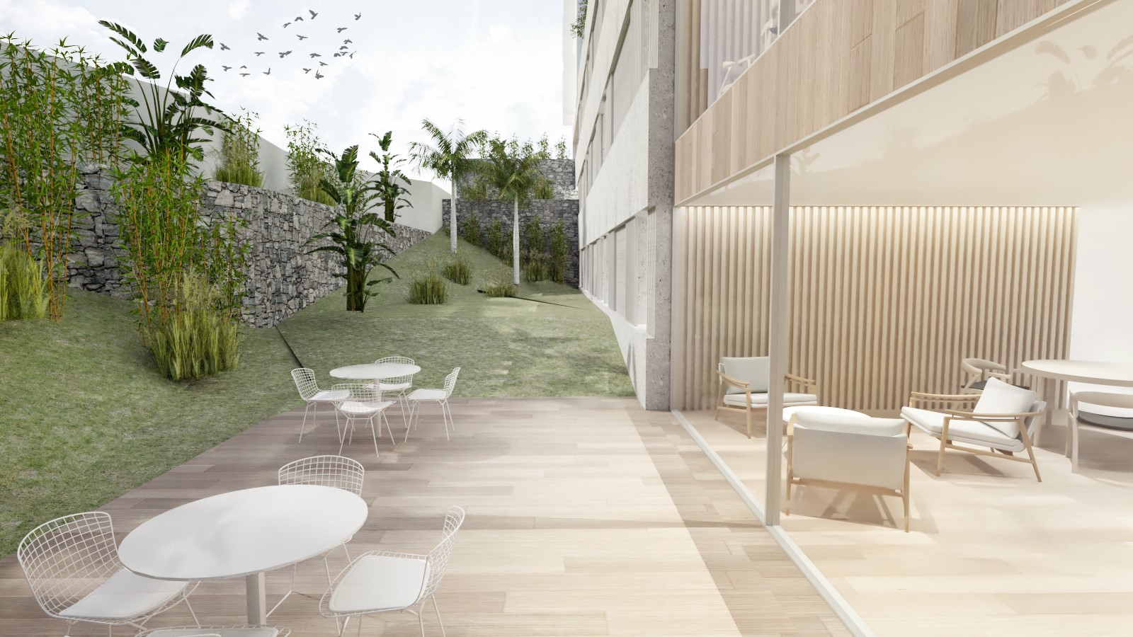 La relación de las zonas comunes con el exterior se produce en planta 00 (nivel de calle) a través de una cubierta ajardinada y el nivel -02 (nivel de jardín). En los niveles 01 y -01 se desarrollan las habitaciones en su mayoría con vistas al mar.
