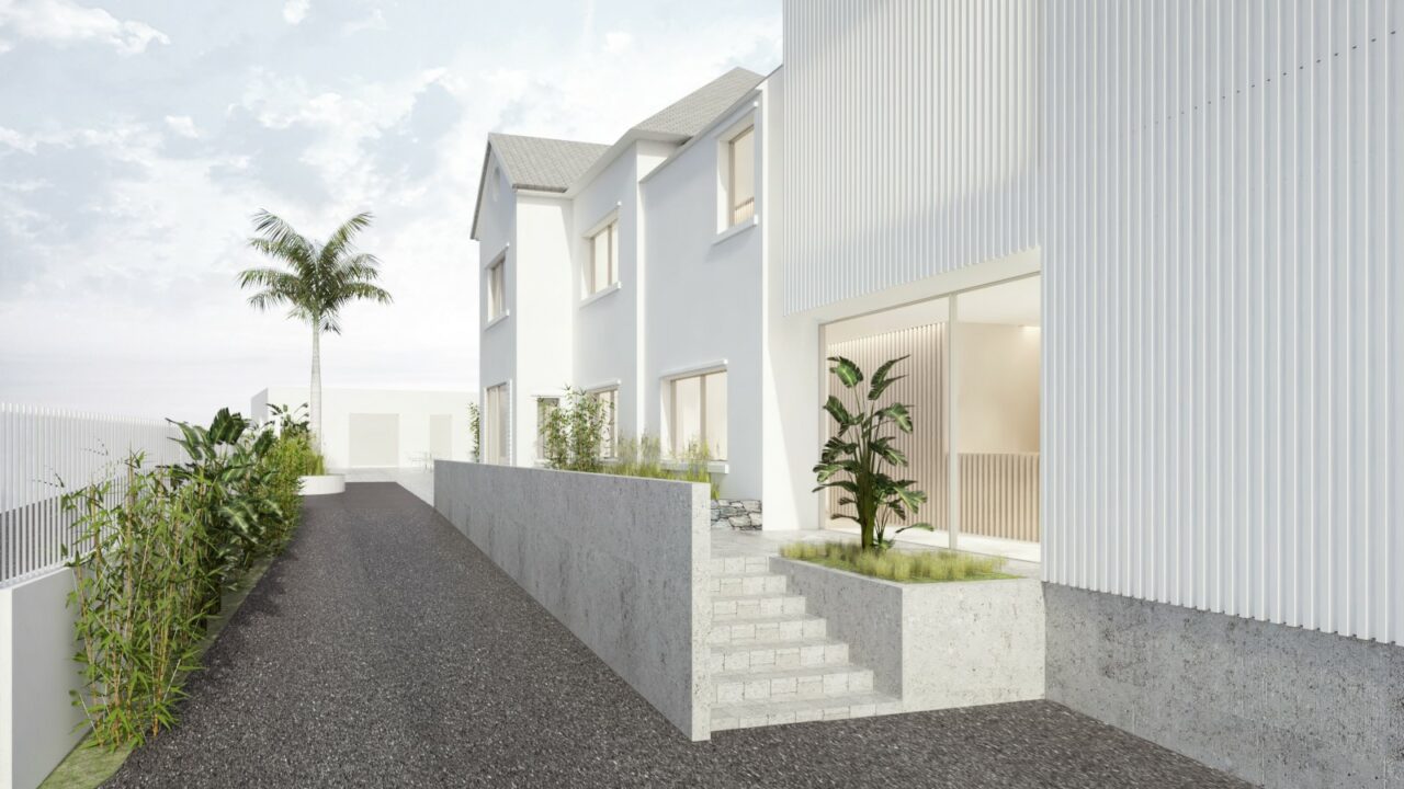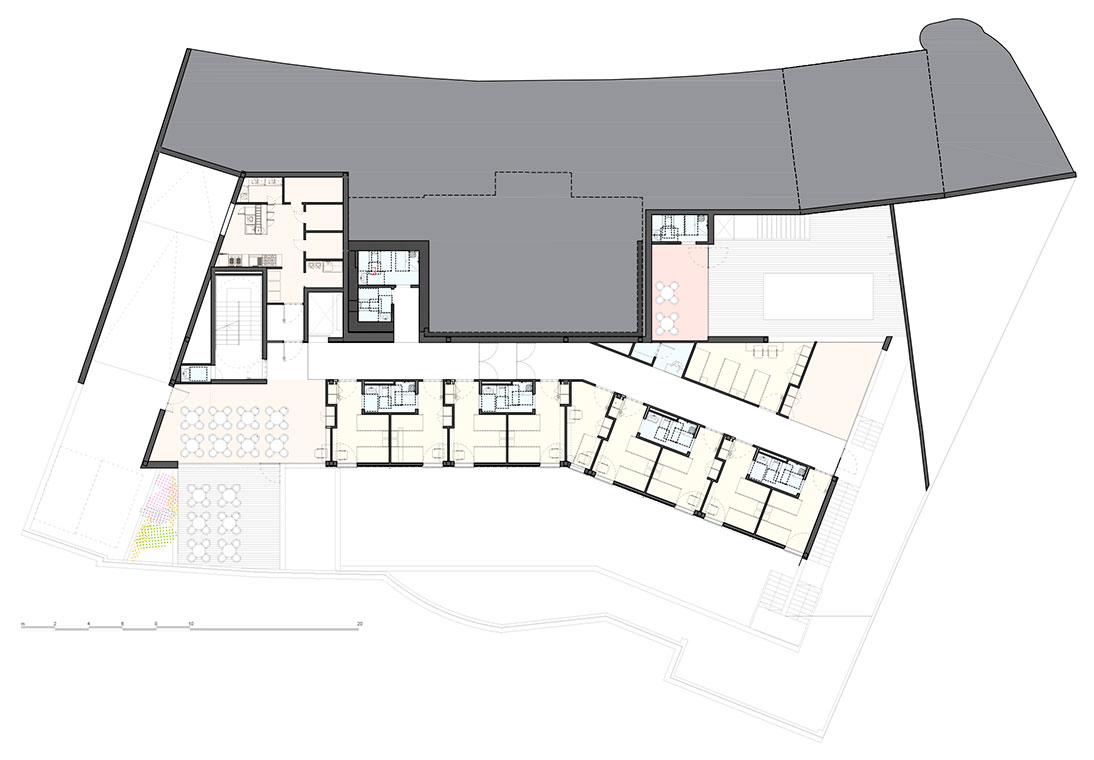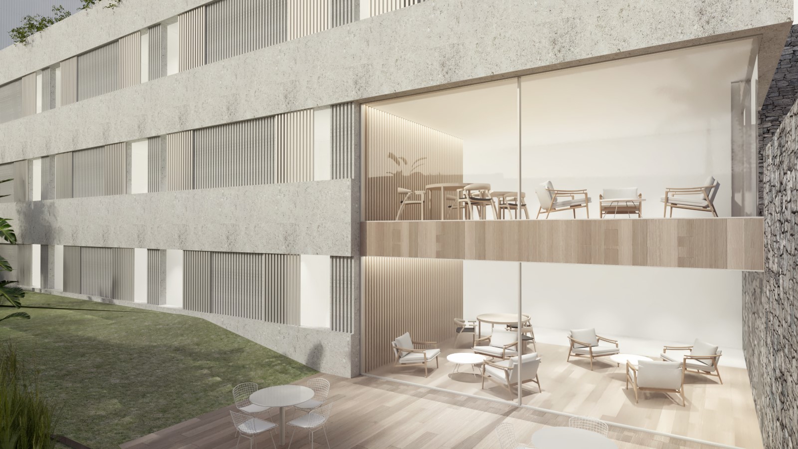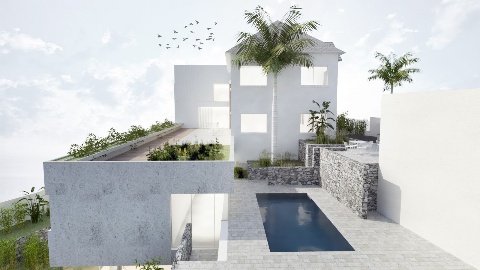 La relación de las zonas comunes con el exterior se produce en planta 00 (nivel de calle) a través de una cubierta ajardinada y el nivel -02 (nivel de jardín). En los niveles 01 y -01 se desarrollan las habitaciones en su mayoría con vistas al mar.