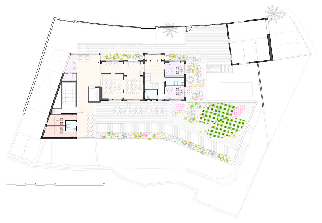 Otro de los elementos que se tuvieron en cuenta a la hora de plantear la ampliación fue la relación del nuevo edificio con el original. El nuevo volumen intenta poner en valor el edificio original que data de 1931. Otro de los condicionante fue resolver el gran desnivel que existe actualmente entre el jardín trasero y el acceso principal, actualmente los usuarios se sitúan en zonas exteriores ligadas a la carretera ya que el jardín es inaccesible para personas con movilidad reducida.