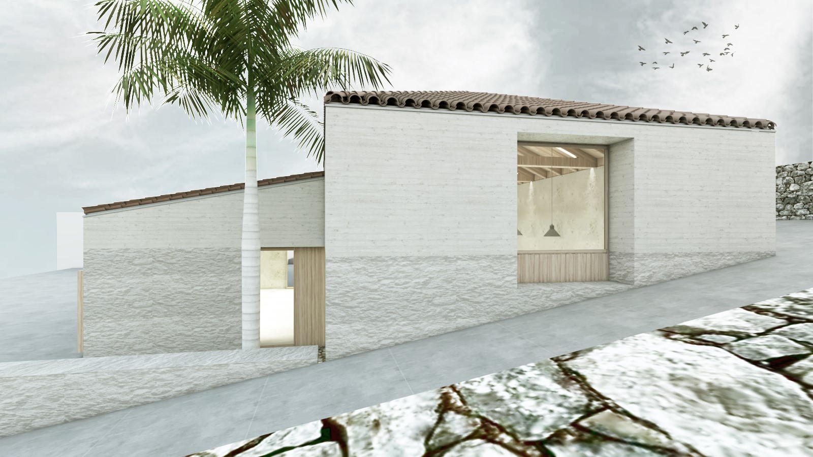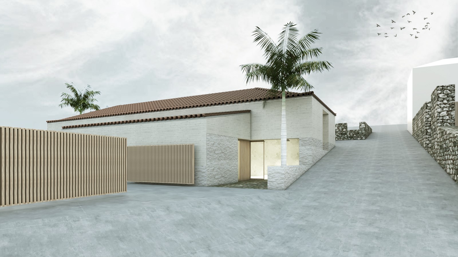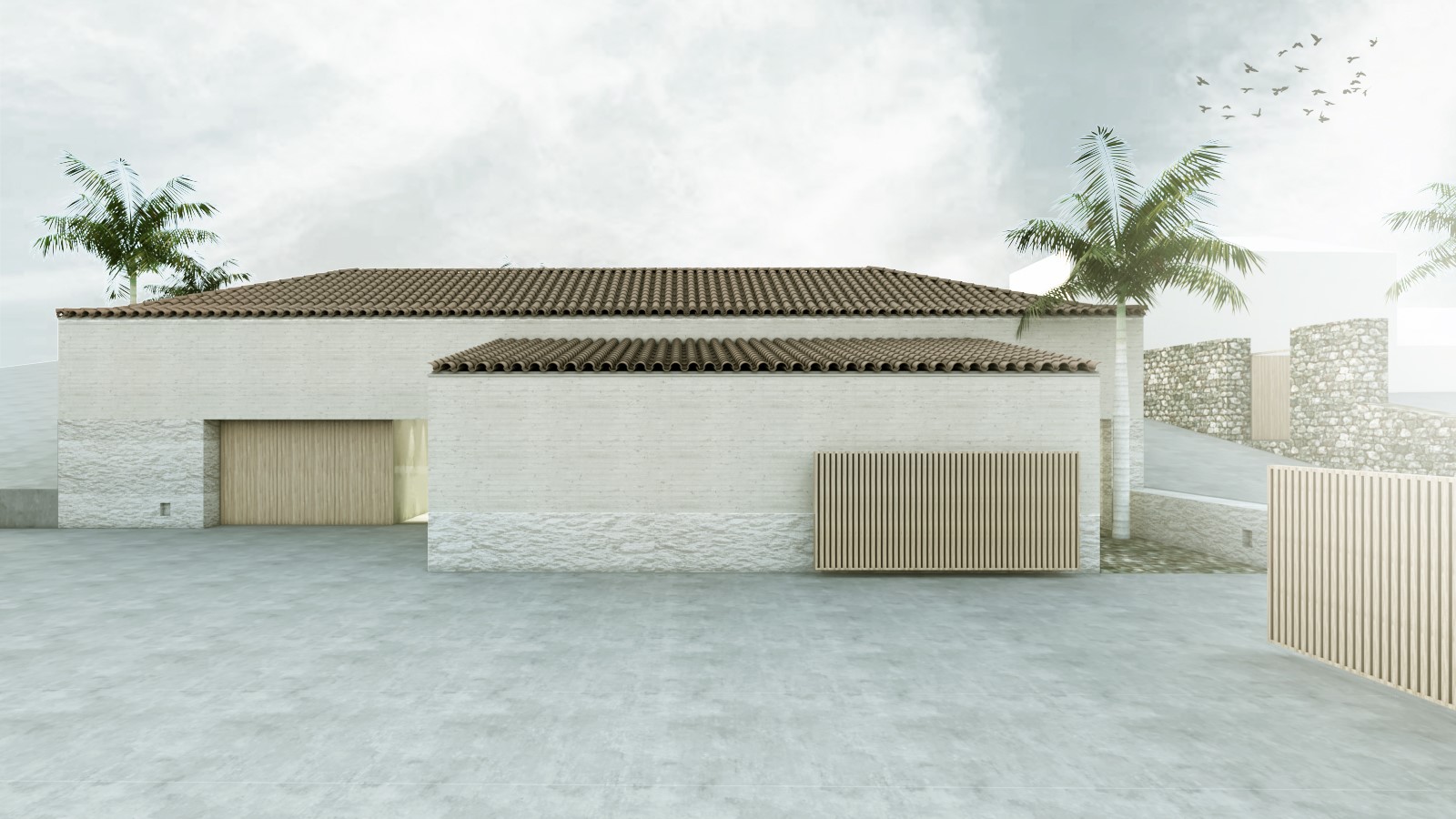 Los dos volúmenes se resuelven con cubierta de teja cerámica curva, a cuatro y a un agua, y su volumetría reconstituye, de manera casi exacta, los volúmenes existentes antes de su demolición. El contacto del edificio con el terreno se resuelve mediante un zócalo en piedra, de altura variable, que se interrumpe solamente allí donde se producen los accesos. De manera general, dicho zócalo asciende hasta la altura de las puertas (2m10) y varía para adaptarse al terreno. Sobre este zócalo, la fachada del edificio se resuelve con un muro de hormigón visto y las cubiertas son de teja cerámica.