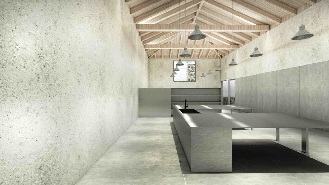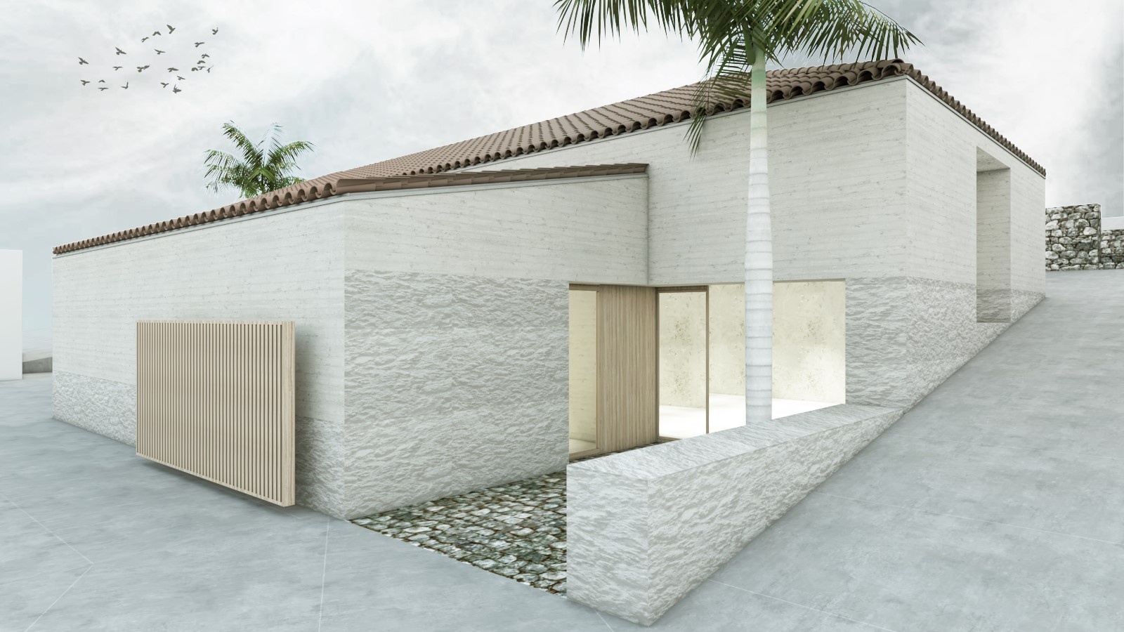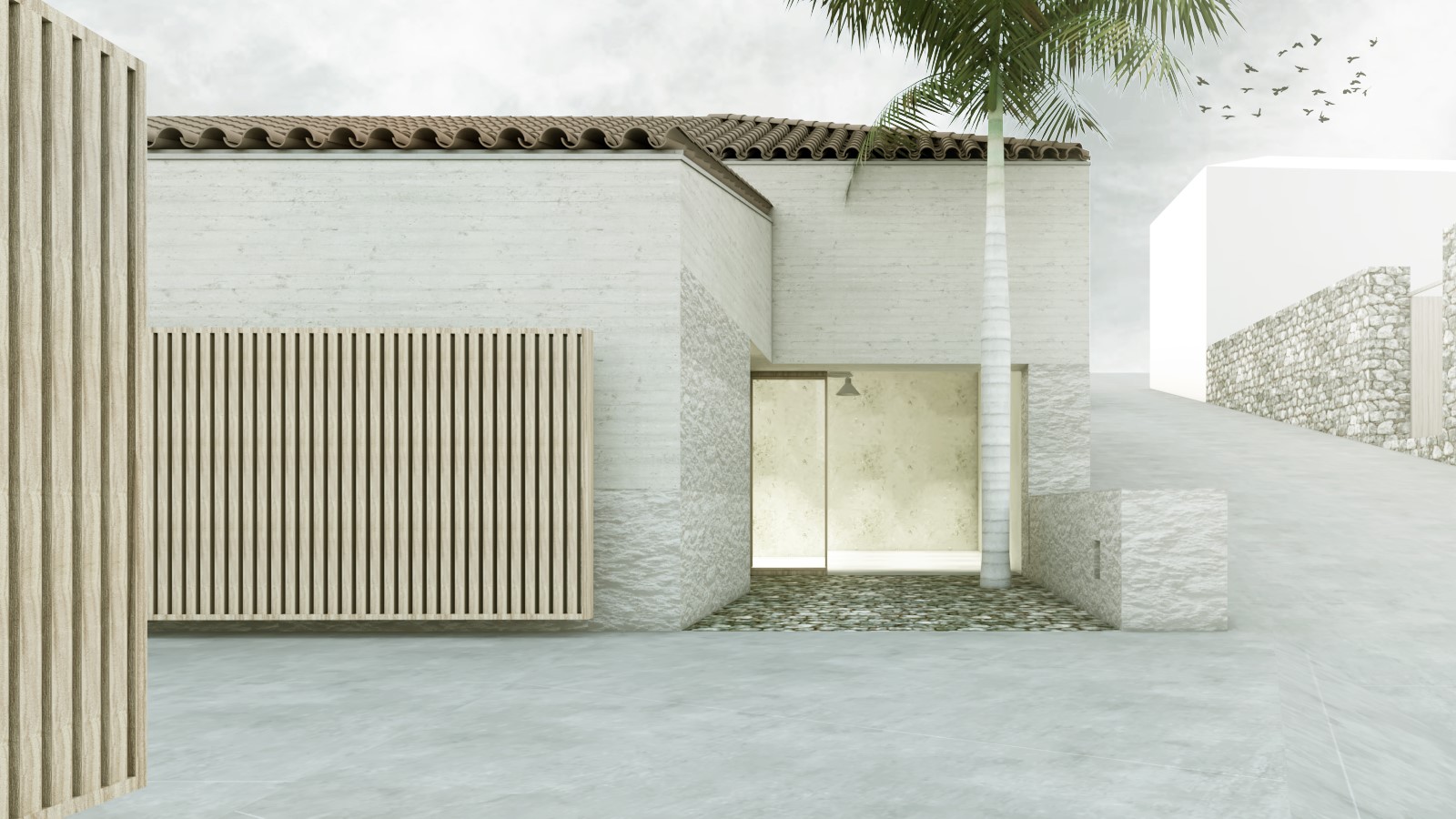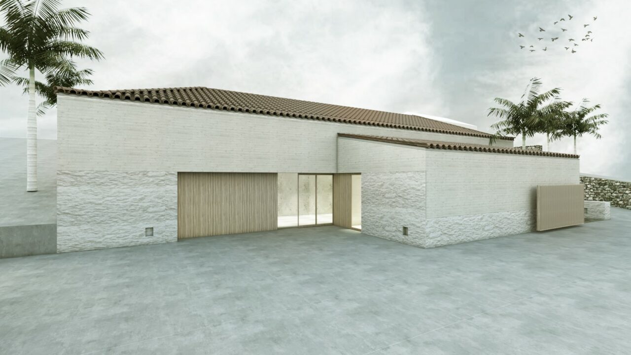 Los dos volúmenes se resuelven con cubierta de teja cerámica curva, a cuatro y a un agua, y su volumetría reconstituye, de manera casi exacta, los volúmenes existentes antes de su demolición. El contacto del edificio con el terreno se resuelve mediante un zócalo en piedra, de altura variable, que se interrumpe solamente allí donde se producen los accesos. De manera general, dicho zócalo asciende hasta la altura de las puertas (2m10) y varía para adaptarse al terreno. Sobre este zócalo, la fachada del edificio se resuelve con un muro de hormigón visto y las cubiertas son de teja cerámica.