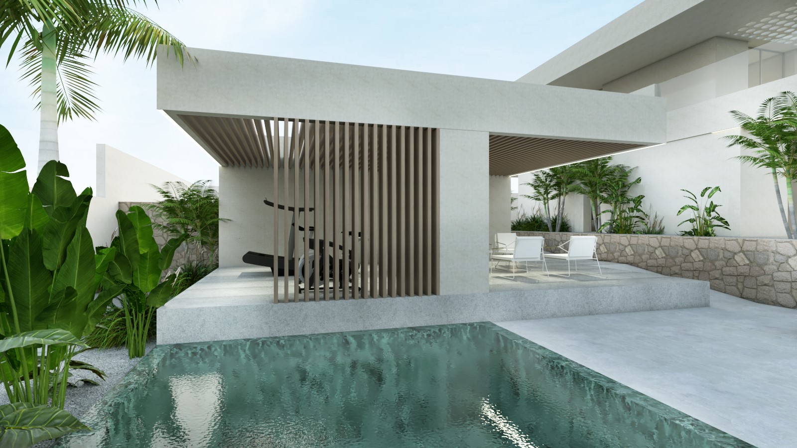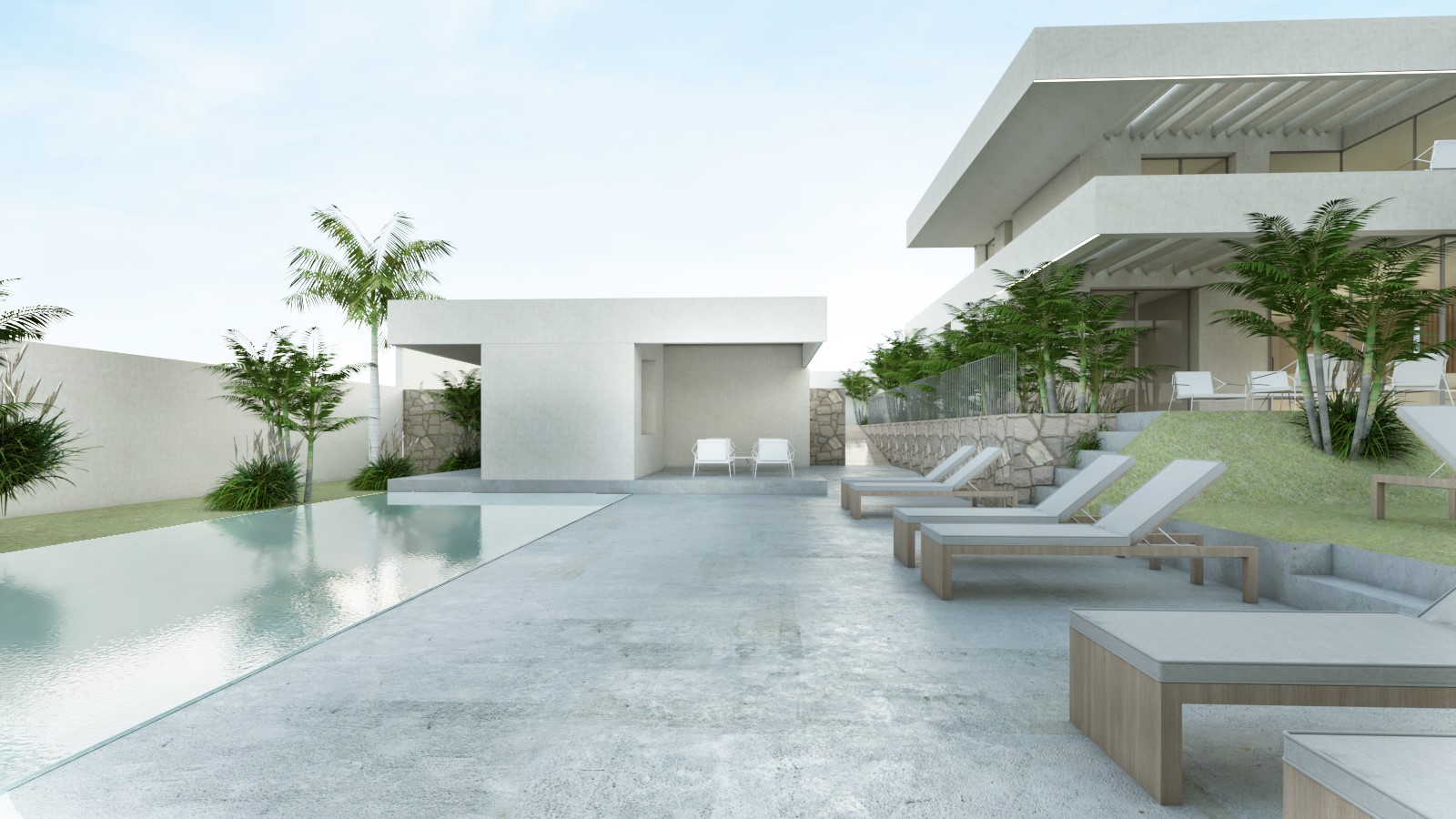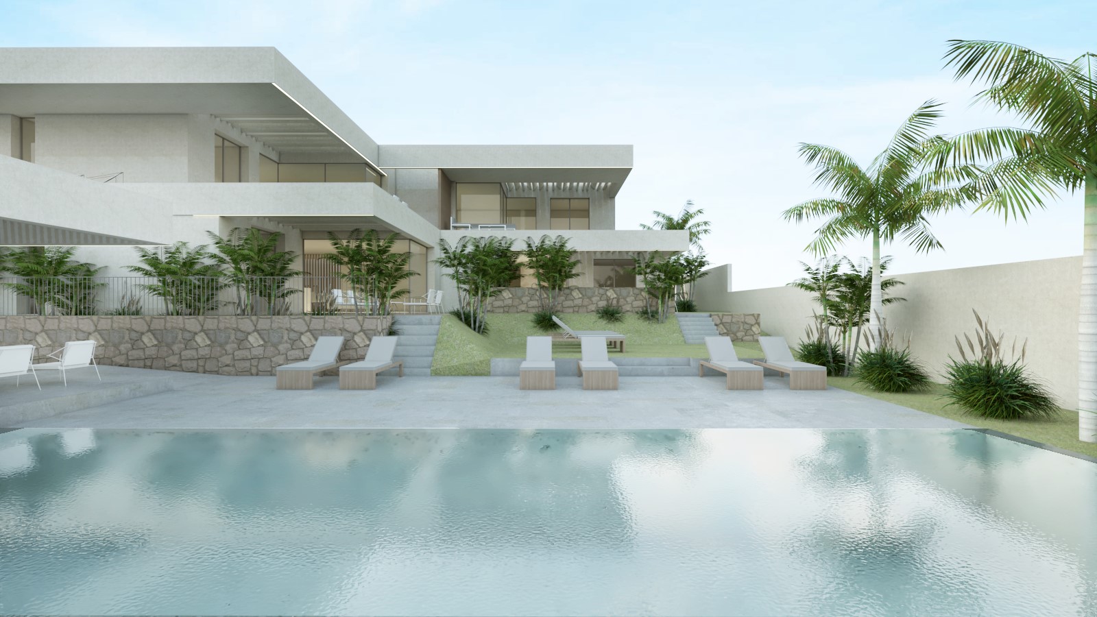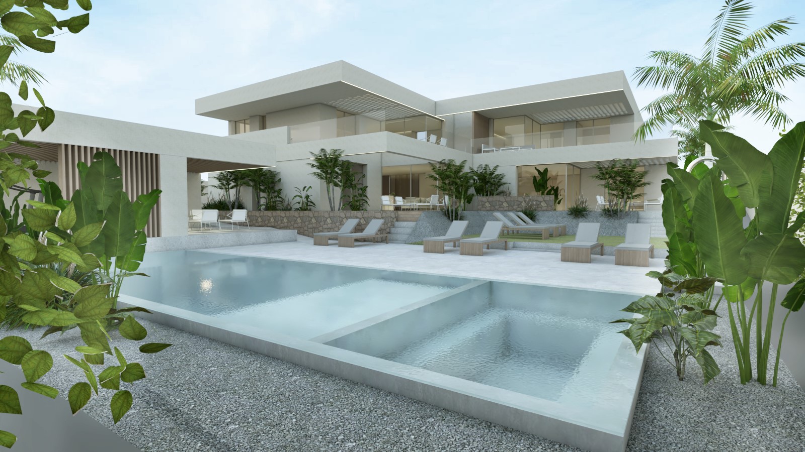 Se potencian las aperturas en fachadas en las zonas de día de la vivienda y se minimizan en los espacios más íntimos. Una gran piscina remata la esquina sureste de la parcela. El espacio exterior se plantea como un gran oasis.
